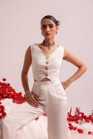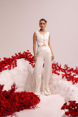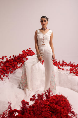 Short waist coat look combined with resham embroidered panelled pants at the sides.
