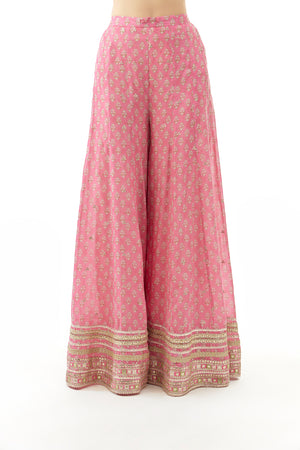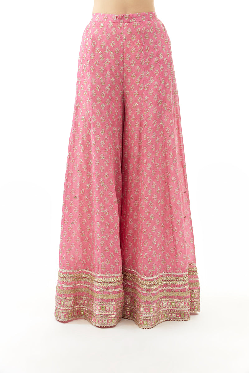 The sleeveless peplum kurta features a deep V-neckline, adorned with intricate embroidery, adding shimmer and sophistication. The flare of the top is mirrored in the wide-legged palazzo pants, which boast matching prints and richly embroidered borders and completed with a dupatta.