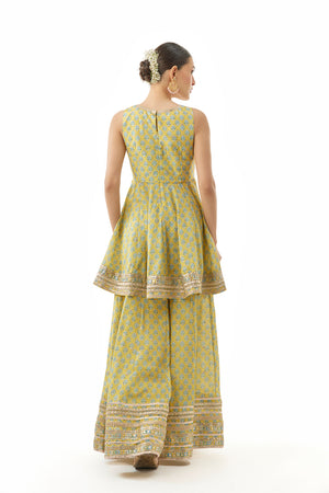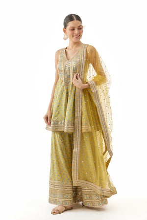The sleeveless peplum kurta features a deep V-neckline, adorned with intricate embroidery, adding shimmer and sophistication. The flare of the top is mirrored in the wide-legged palazzo pants, which boast matching prints and richly embroidered borders and completed with a dupatta.
