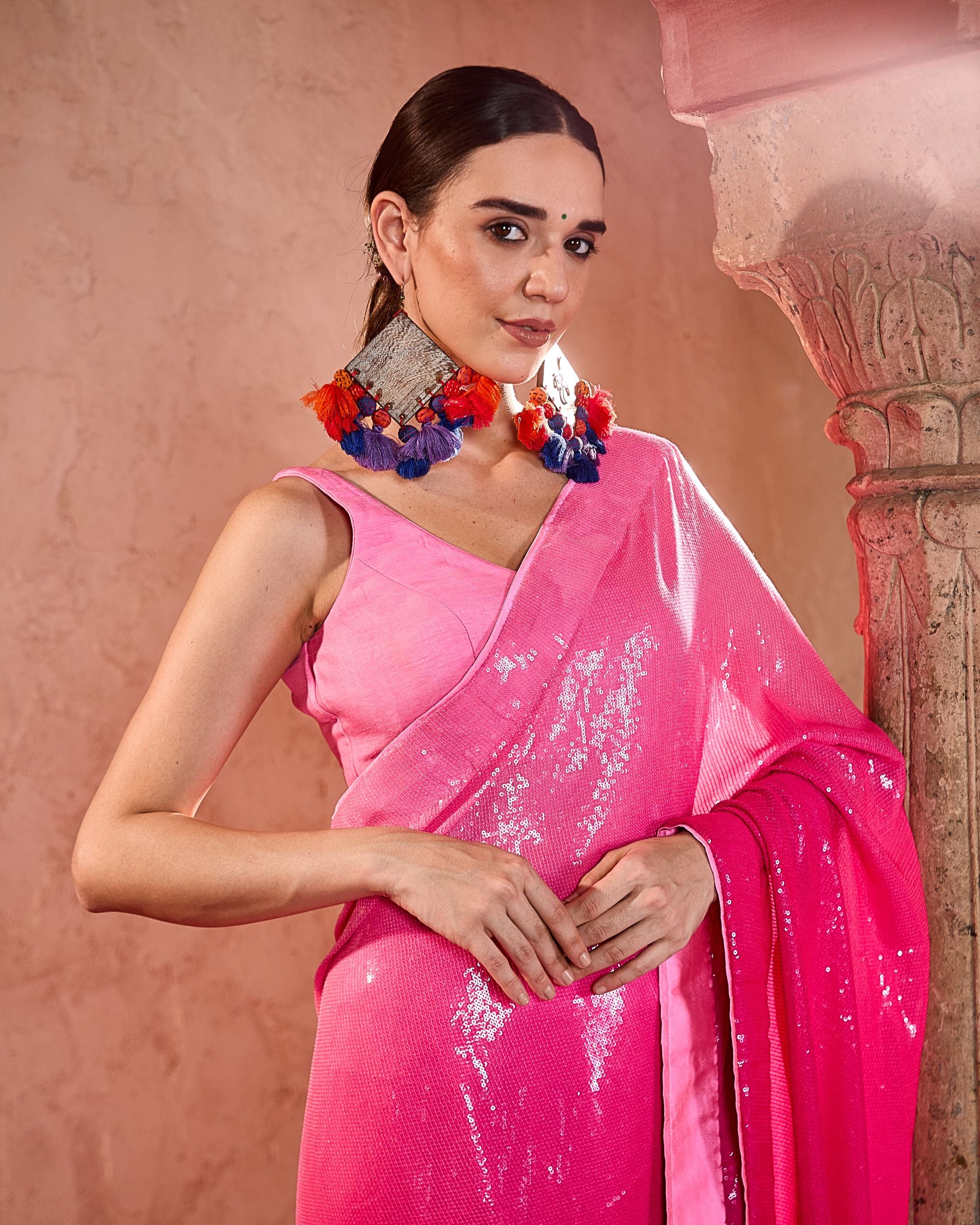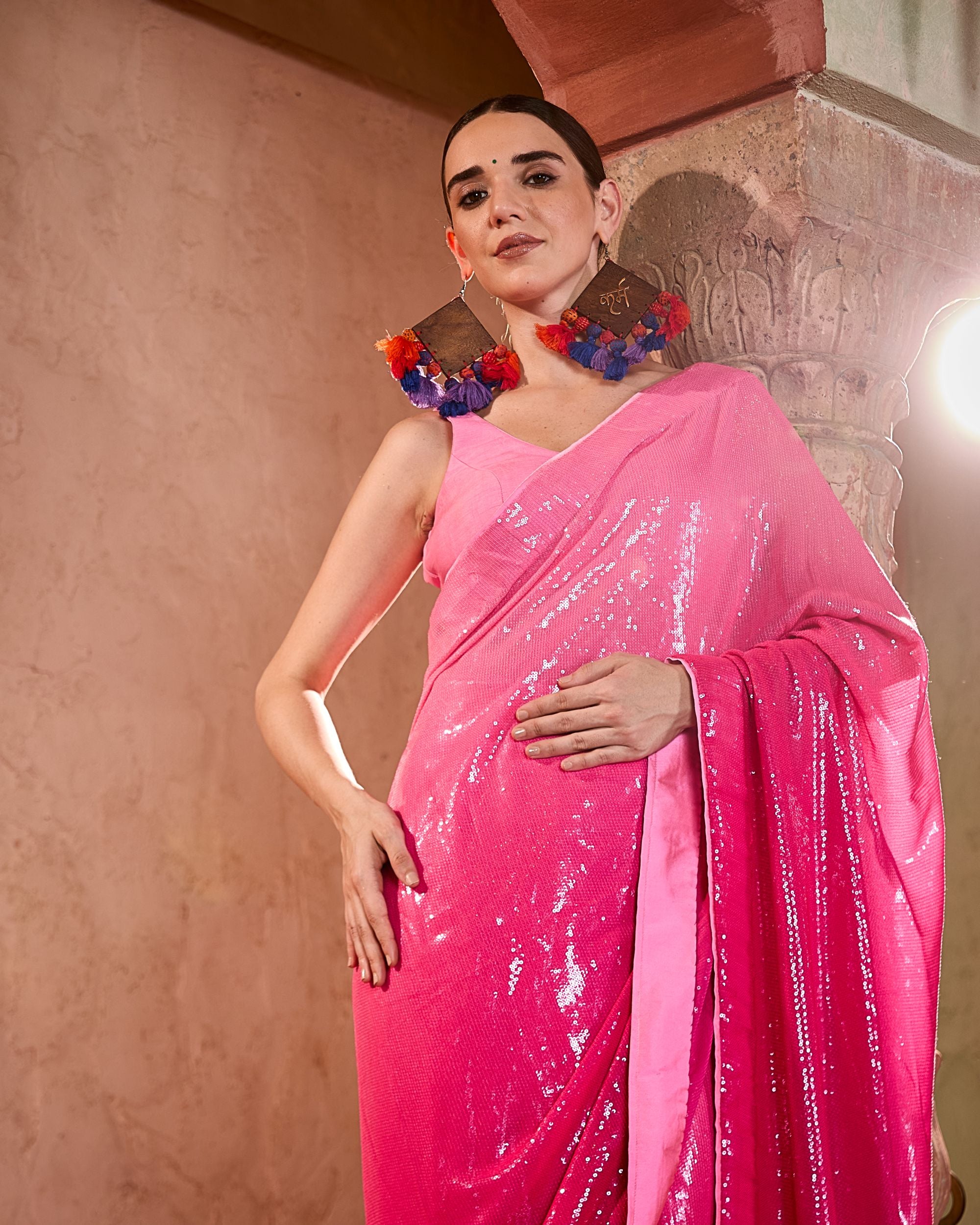 The Sitara Saree is a sequin ombré-dyed drape in georgette, paired with a raw silk blouse. Glamorous and festive, it’s perfect for evening celebrations.