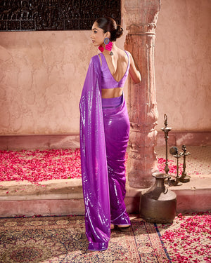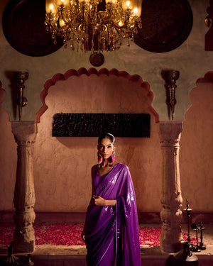The Sitara Saree is a sequin ombré-dyed drape in georgette, paired with a raw silk blouse. Glamorous and festive, it’s perfect for evening celebrations.