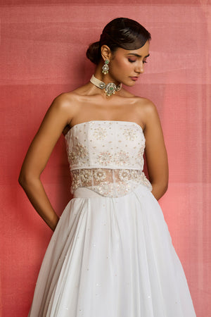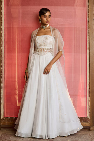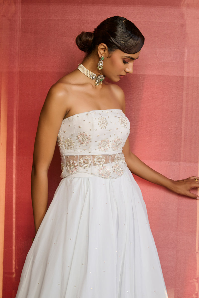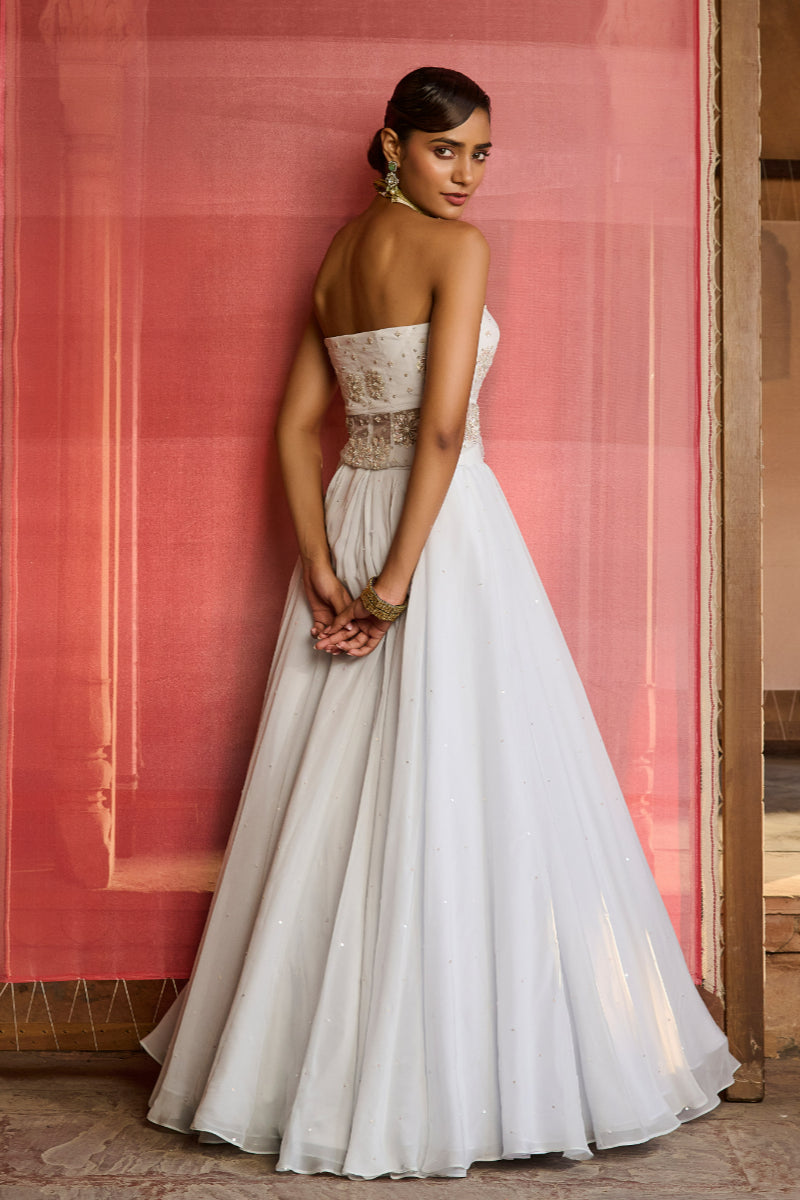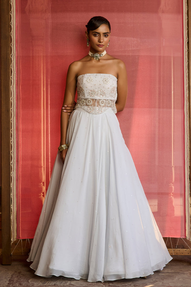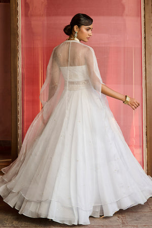 Featuring a beautiful skirt with box pleats and hand embellishment all over in organza. It is paired with a corset blouse in organza with side opening and detailed hand embroidery all over. The set comes with a jacket overlay in silk organza having daintyl motifs and a beautiful border in the front .