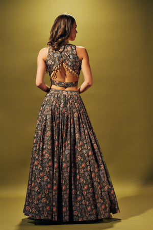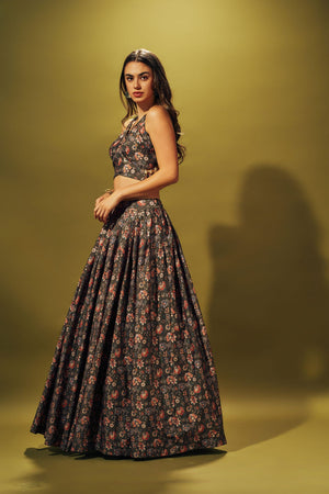 Olive green floral printed skirt in crepe silk paired up with matching overlapping blouse embellished with stones
