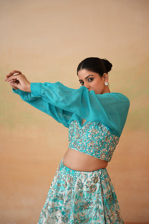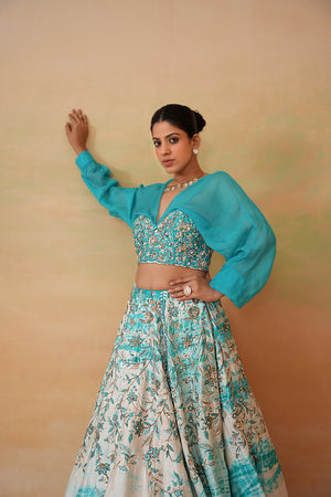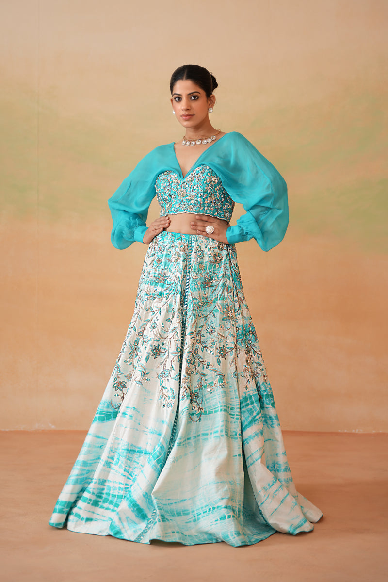 Deepika Chadha's stunning Sky blue organza fabric blouse is beautifully adorned with intricate sequins, pearls, cutdana embroidery he flowy sky blue and Ivory dupion fabric tie and dye lehenga which adds a touch of sophistication to your look and keeps you comfortable all day long and is perfect for wedding and festive season.