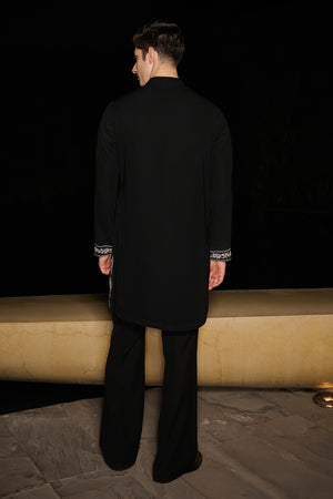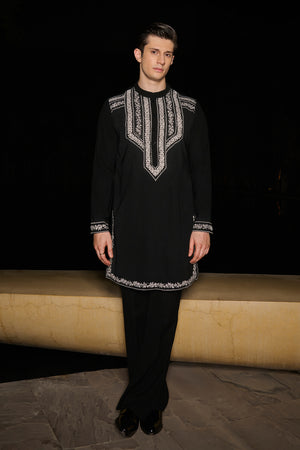 Kurta embellished with intricate resham work, forming geometric and floral motifs, paired with pants