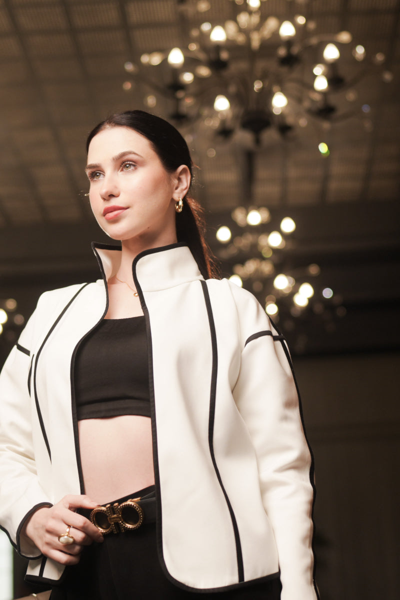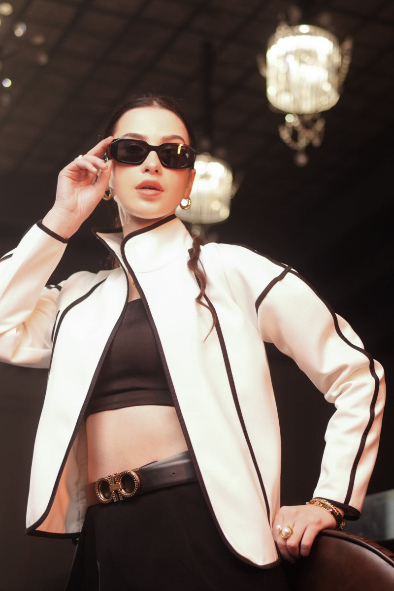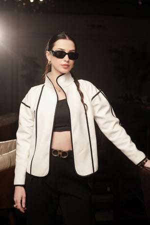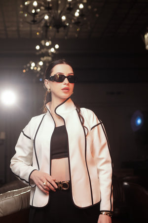 White jacket very chic and trendy can be paired with a short skirt or trousers. This stylish piece is perfect for creating a fashionable look, whether you want to dress it up with a skirt for a night out or keep it casual with trousers for a day look. The versatility of a white jacket makes it a must-have in any wardrobe, allowing you to mix and match for various occasions.