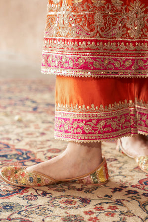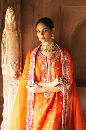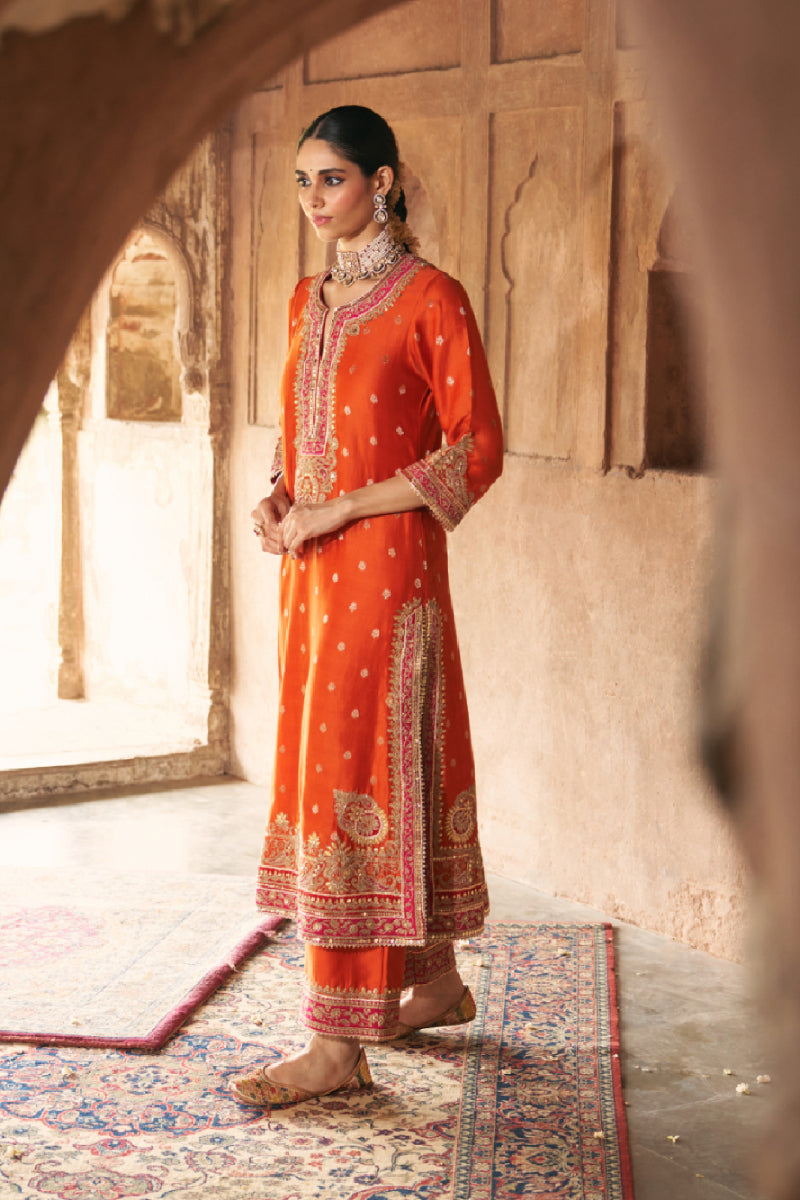 A graceful long A-line kurta paired with palazzos and a silk organza dupatta. The kurta features a zero neckline with placket and three-quarter sleeves. Adorned with intricate Kashmiri Tilla and Gota Patti embroidery, highlighted with pearls and sequins, the ensemble is beautifully finished with delicate gota detailing.