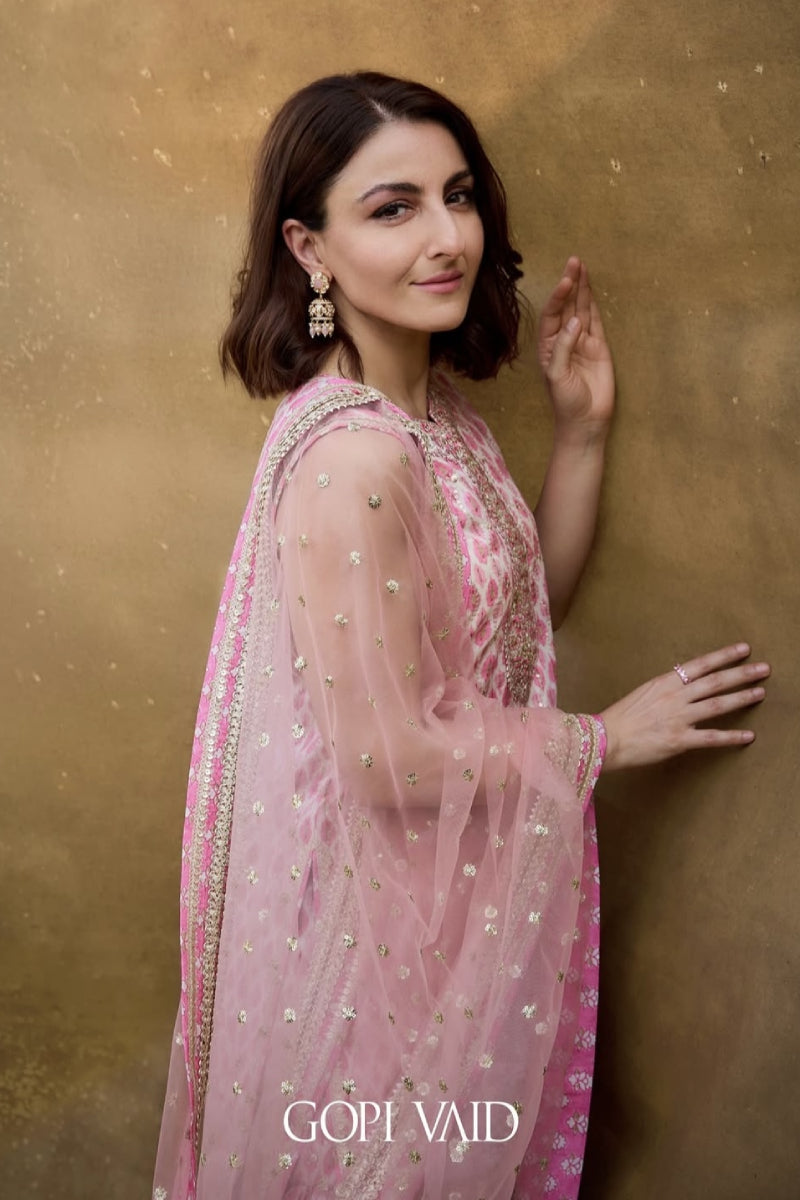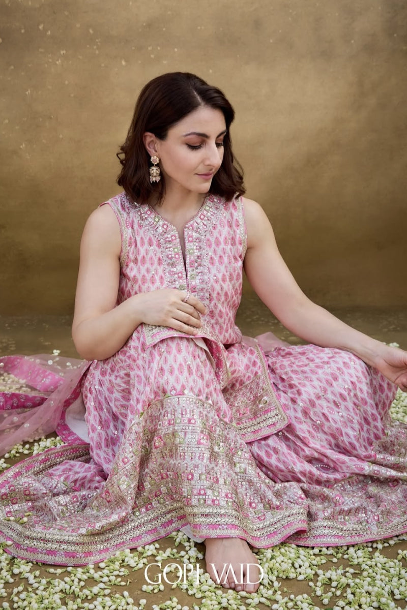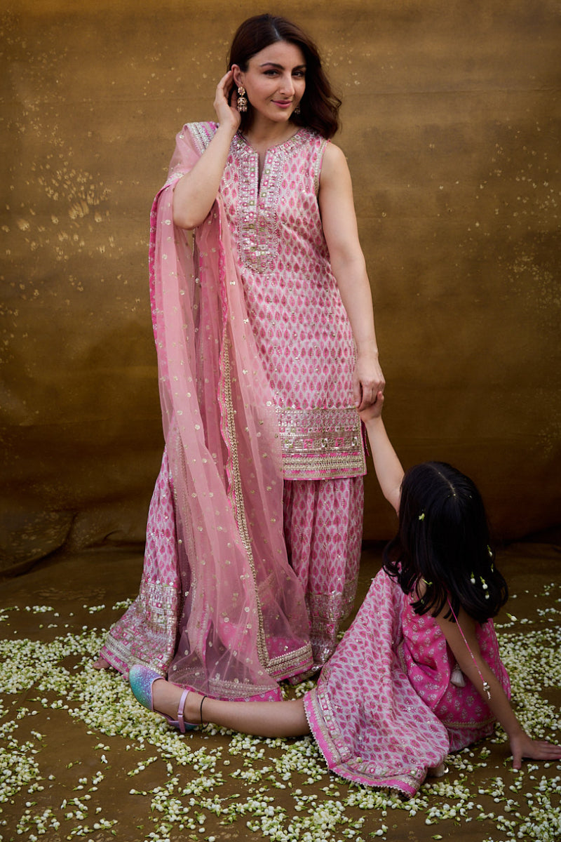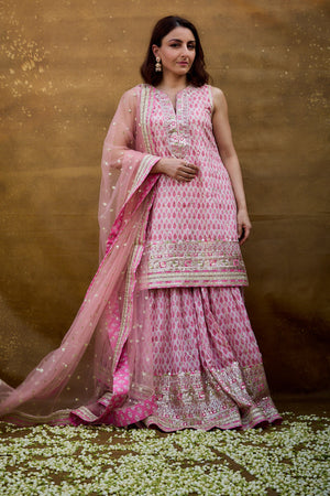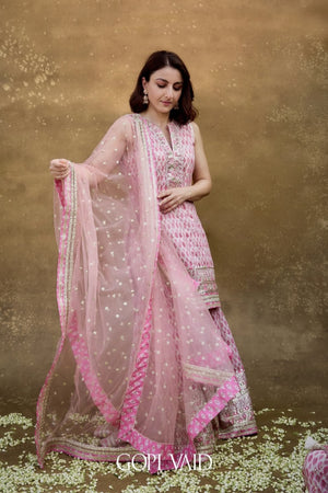 The sleeveless kurta features a straight, elongated silhouette adorned with delicate embroidery along the neckline and hem. Paired with a wide-flared sharara pant in a coordinating print, the set is balanced with an airy dupatta accentuated by scattered work and embroidered borders