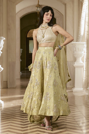 A pistache skirt crafted in lustrous silver jacquard, featuring an ivory blouse with mirrorwork. The skirt mirrors this opulence, embellished throughout with delicate zardozi work that enhances its graceful silhouette. Paired with a sheer organza dupatta, finished with scalloped edges and embroidered borders, and dotted with delicate buttis, this ensemble seamlessly blends traditional craftsmanship with contemporary design.