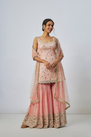 Featuring an intricately embroidered kurta adorned with delicate mirror work and floral detailing, paired with a flowing sharara with mirror embellishments . The net dupatta with subtle mirror work and borders, completes the ensemble.