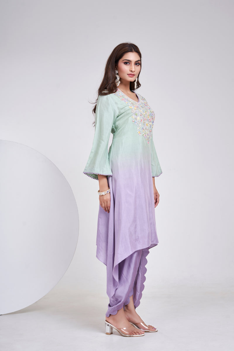 A vibrant ombré kurta set featuring intricate hand-embellished detailing on the neckline and soft scalloped tulip pants. The perfect blend of festive sparkle and playful charm.