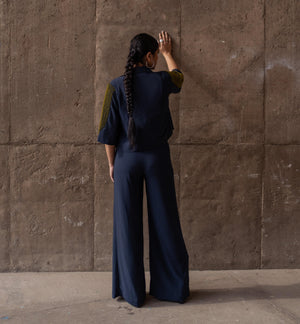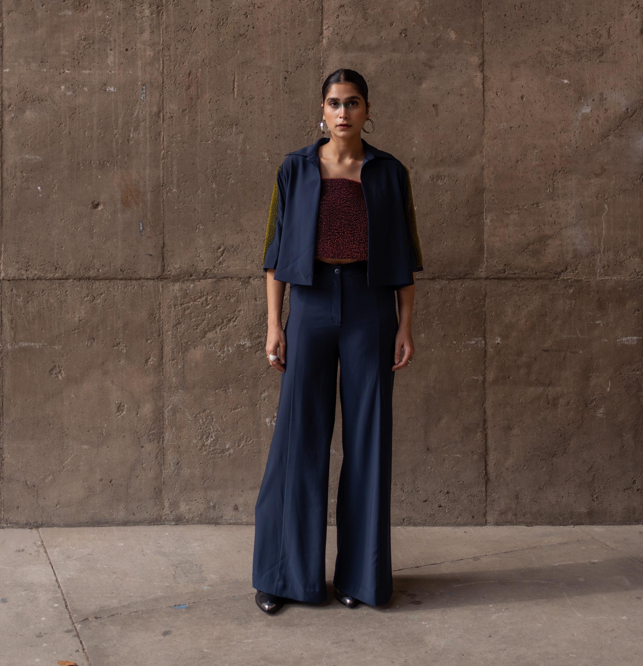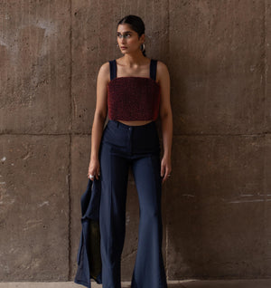 High waisted flared trousers with front seam, waist band cut out pocket both sides
