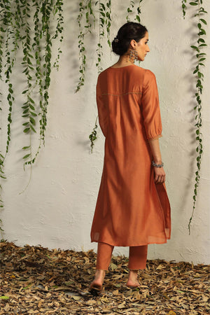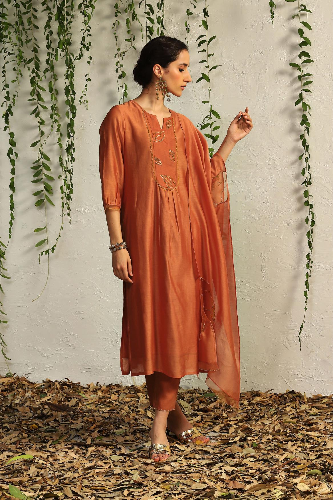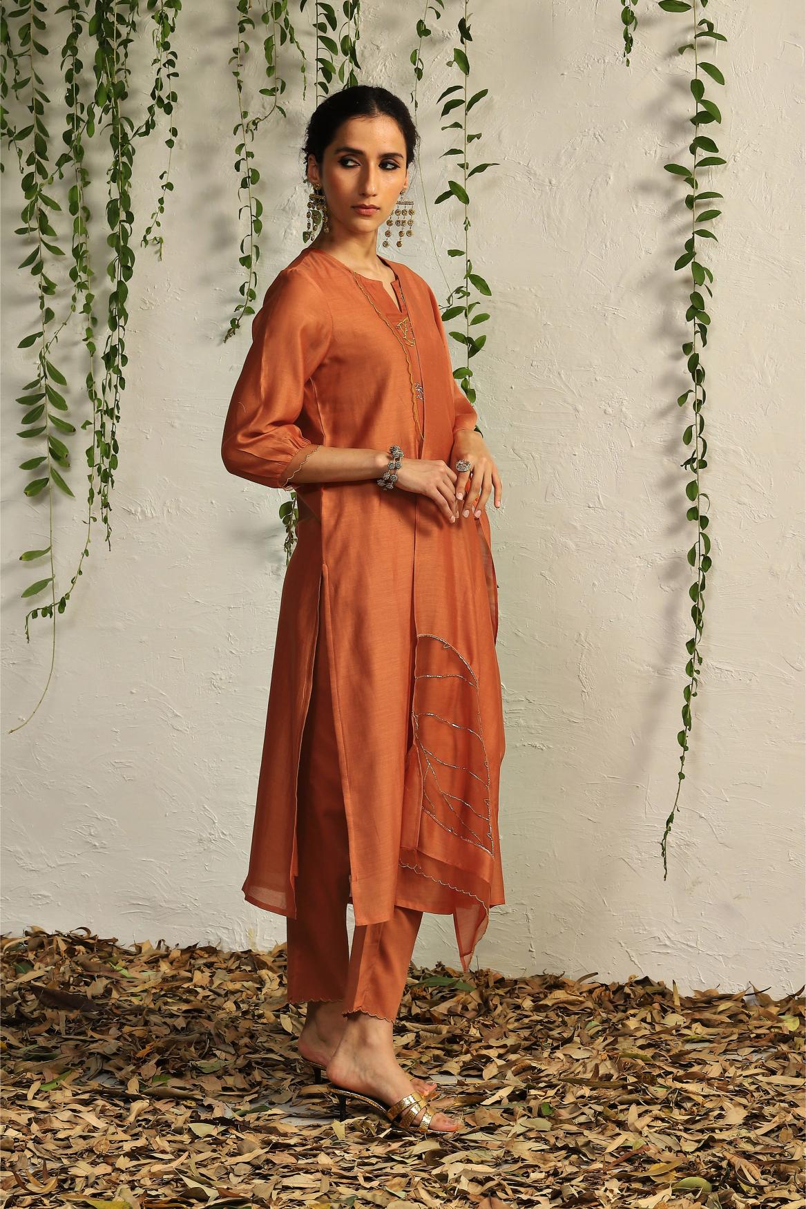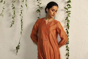 "The timelessness of nature inspired motifs is interpreted through hand embroidered leaf motifs in our spice orange relaxed fit kurta set. The decadence is enhanced with our intricate nakshi and zari work.