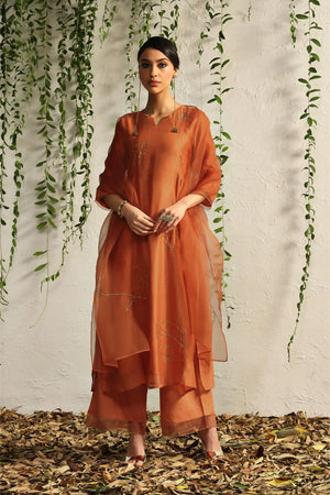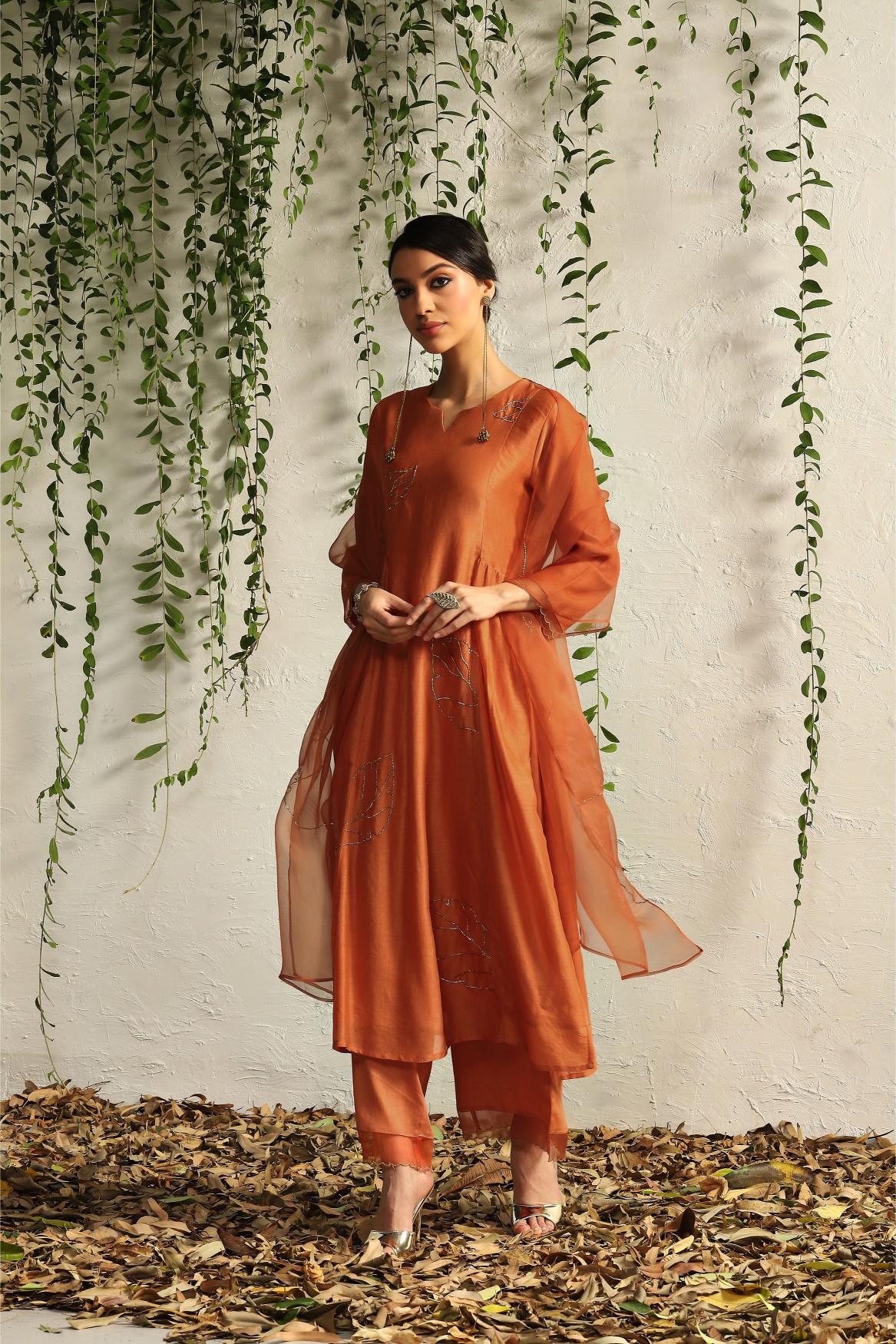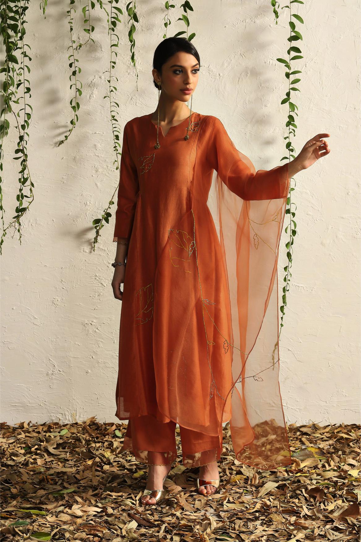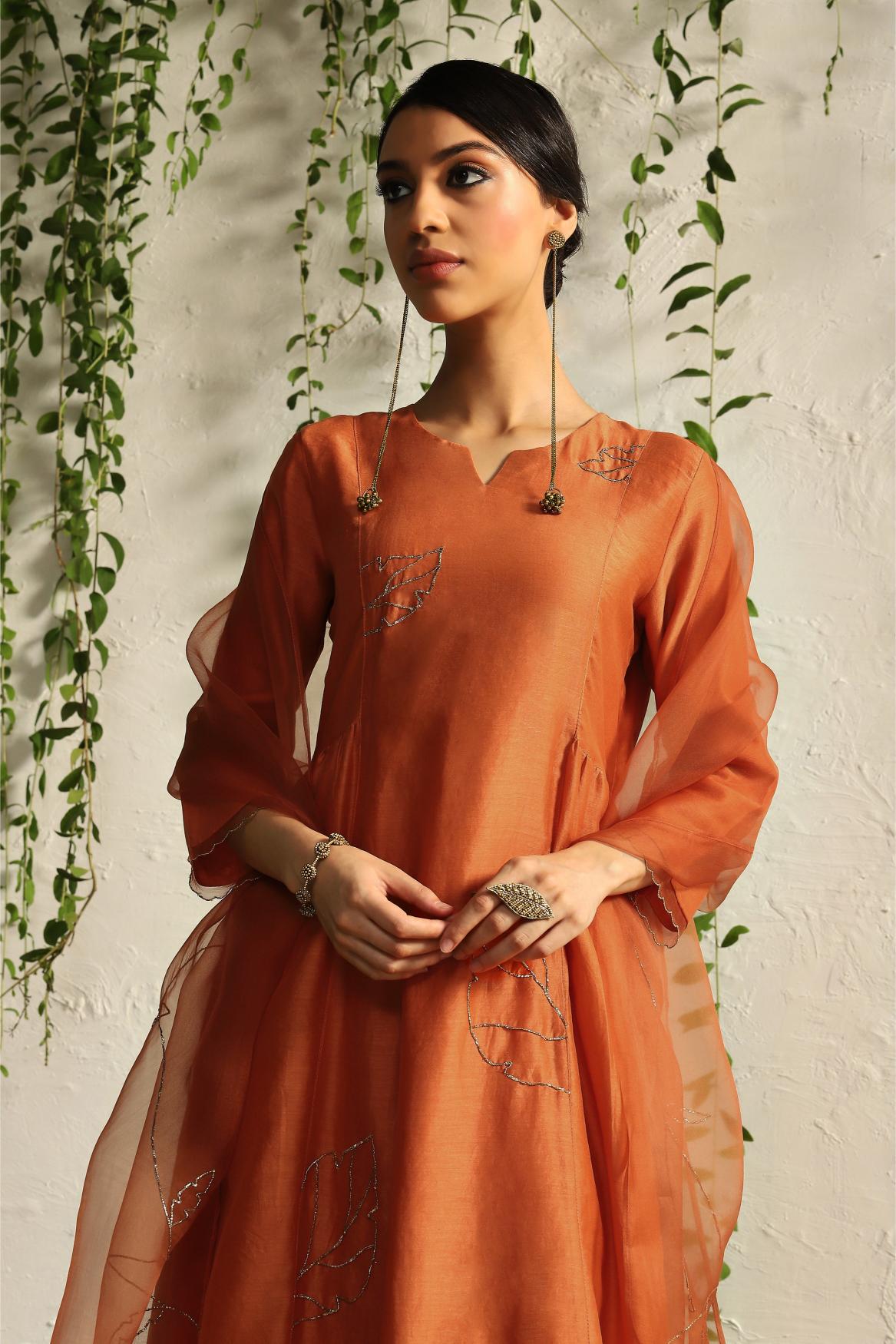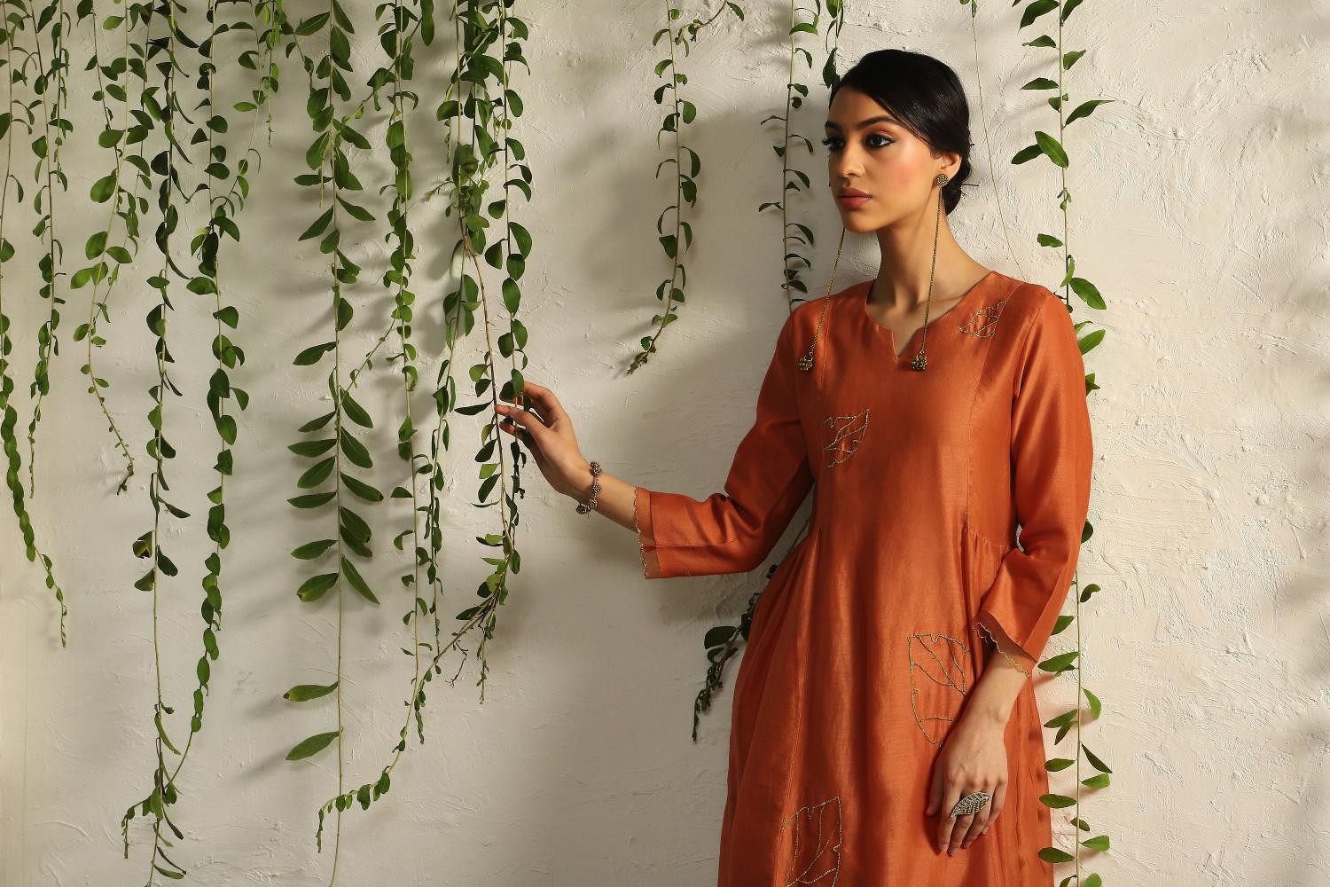This spice orange chanderi kurta in a light and flowing sillhouette with intricate nakshi handwork work is a keepsake.