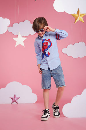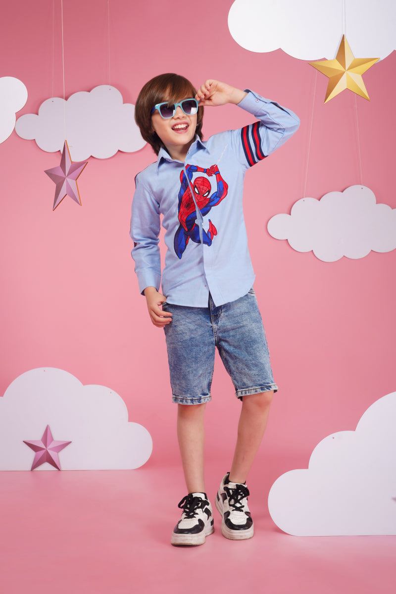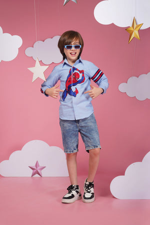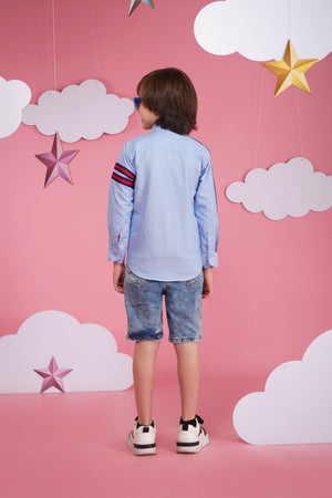 A light blue crisp cotton shirt with lace detailing on the sleeves and embroidery in the front