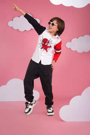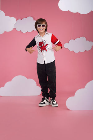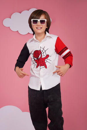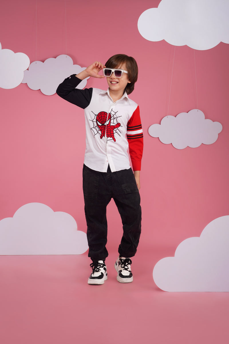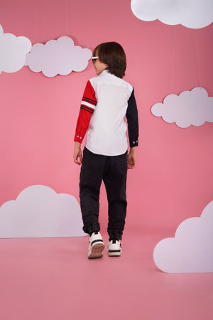 A white crisp cotton shirt with black & red sleeves and embroidery in the front
