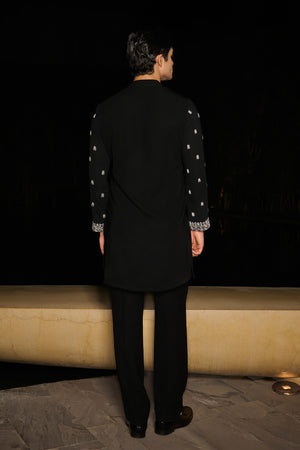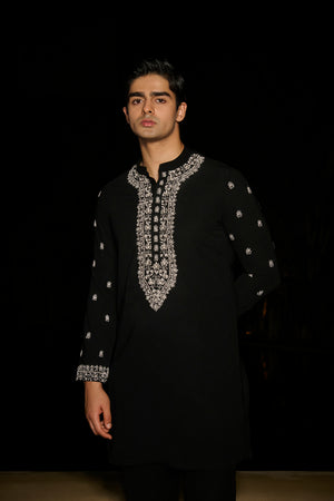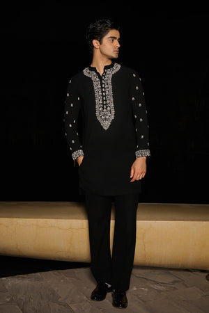 Kurta set featuring abstract floral motifs with intricate resham work, paired with tailored pants