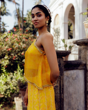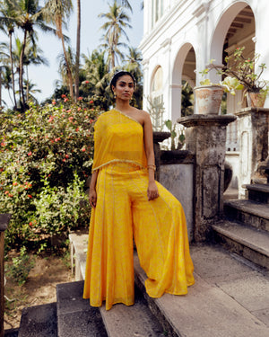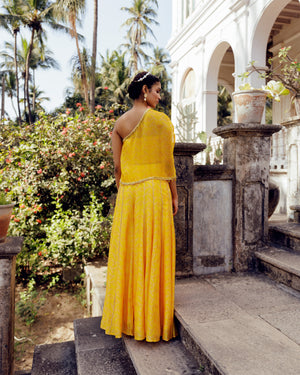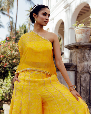 Yellow Leaf Print One Shoulder Cape + Tube With Kali Gharara