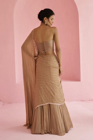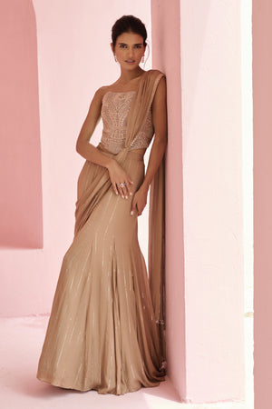 Sequence embellished georgette pre-draped saree paired with glass beads and sequence embroidered corset blouse