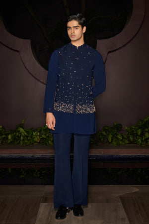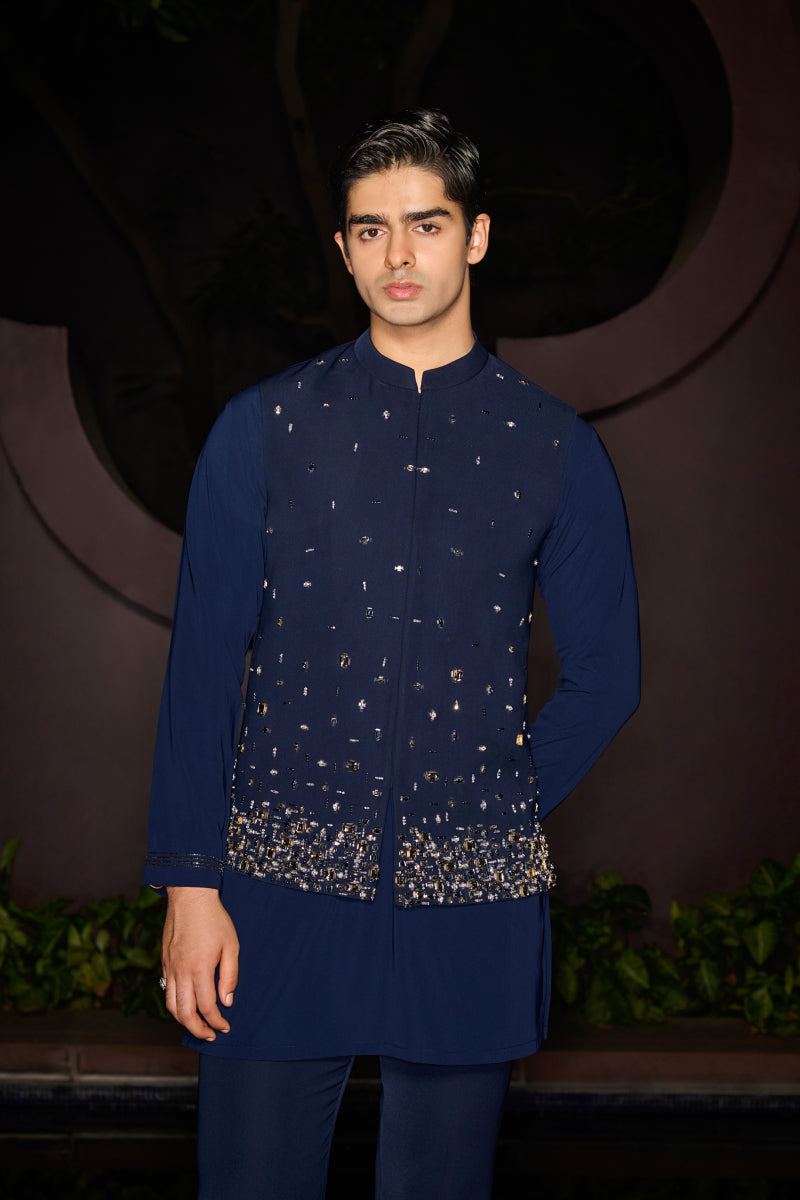 An embellished Nehru jacket adorned with shiny stones, paired with a sleeve-embellished kurta and matching pants