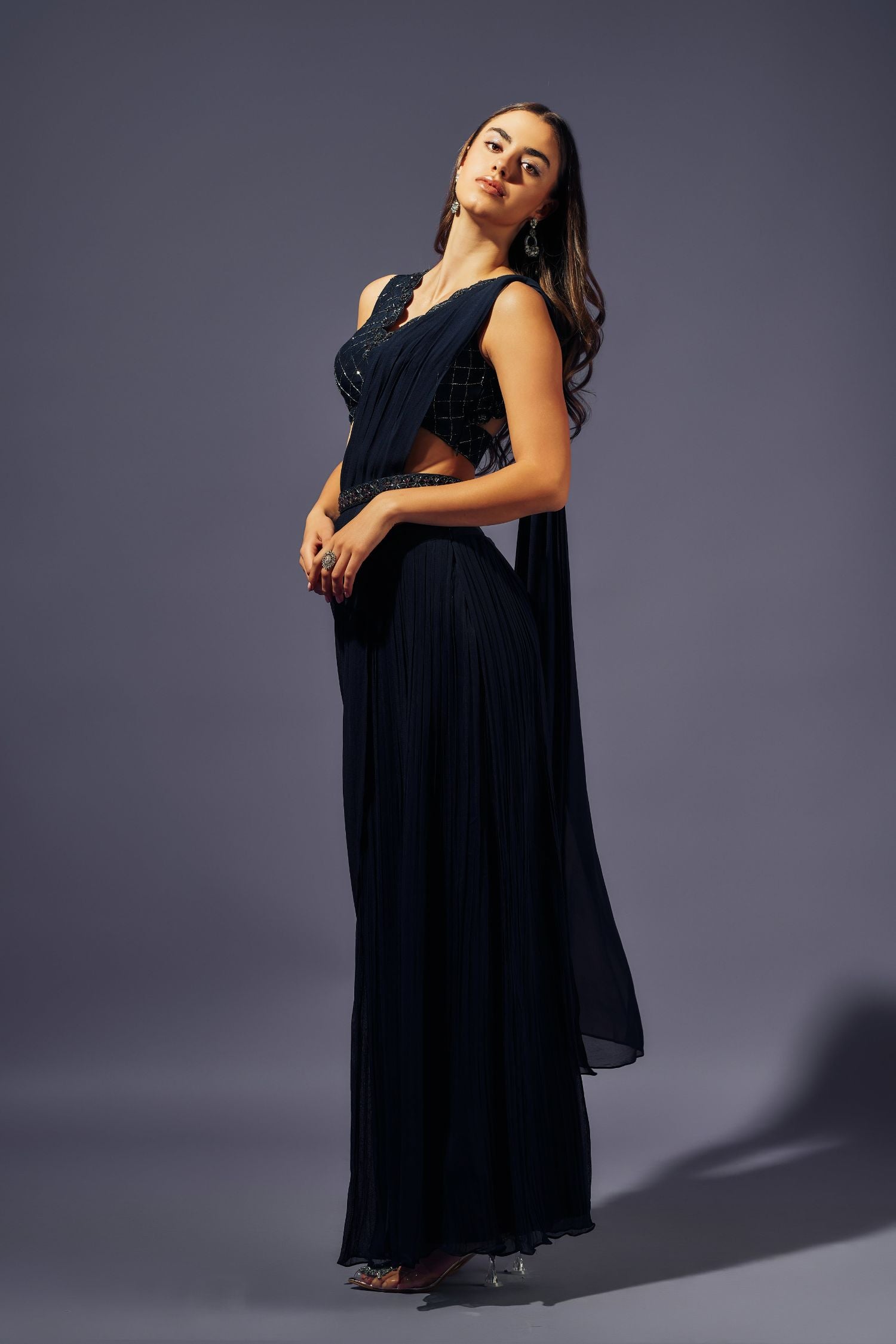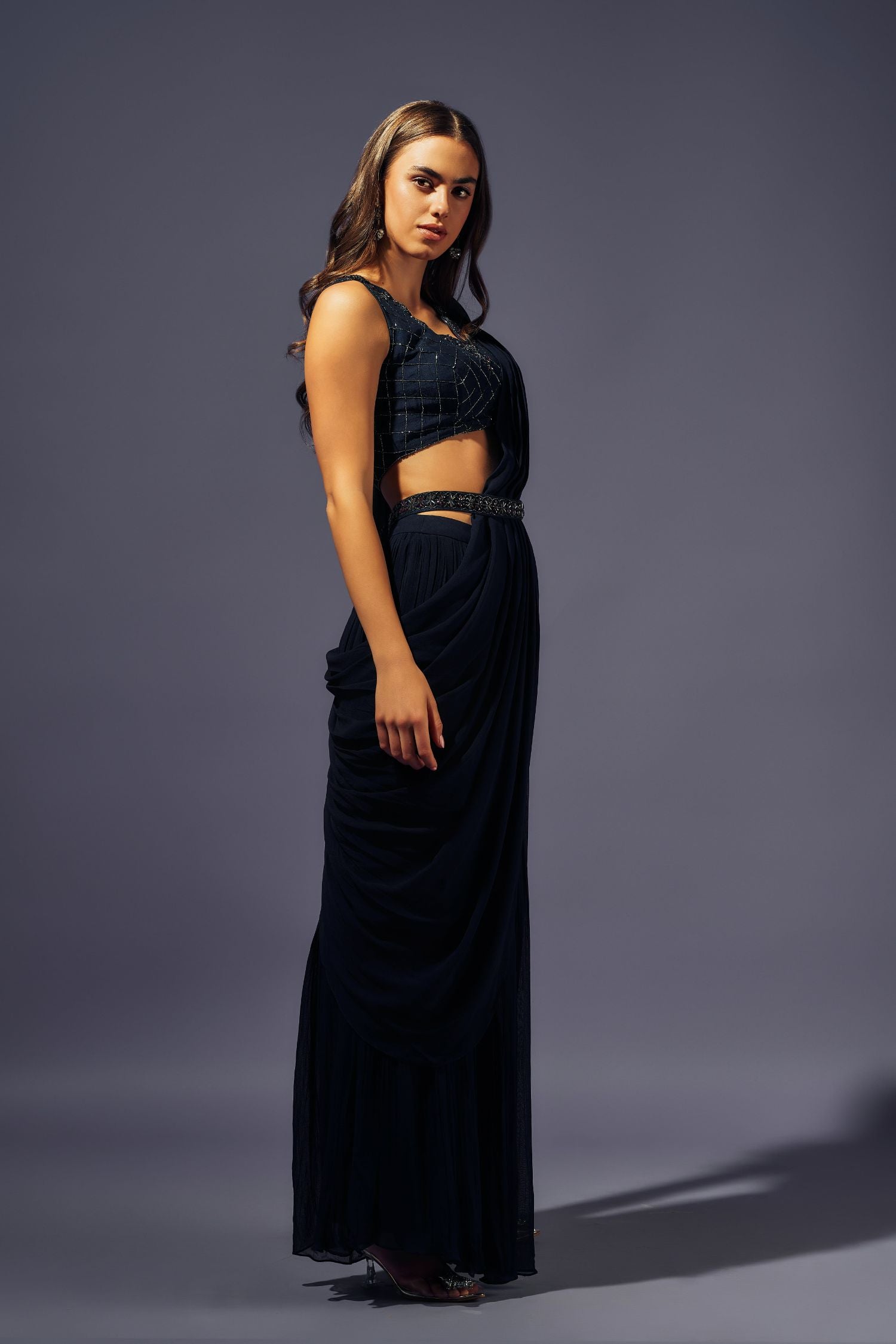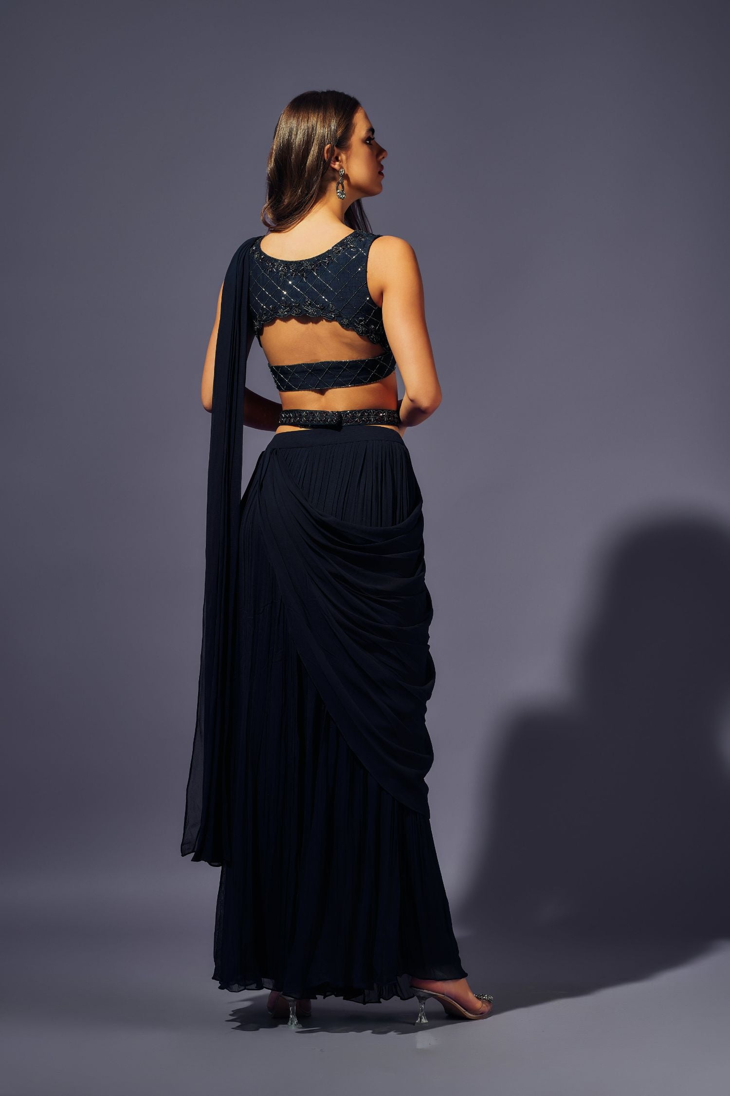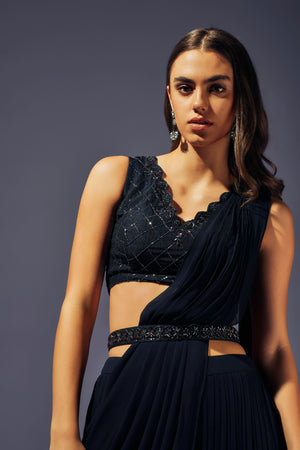 Midnight blue crystals hand embellished Blouse in Dupion silk paired up with pleated georgette plazo and attached drape