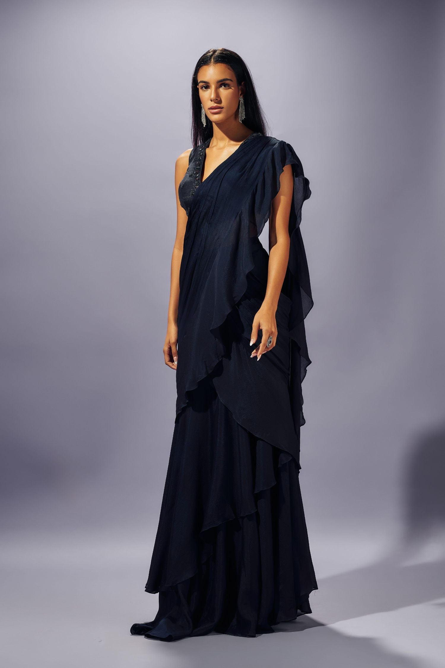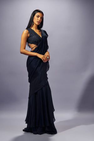 Navy blue hand embellished blouse in tulle fabric paired up with crepe silk ruffle saree