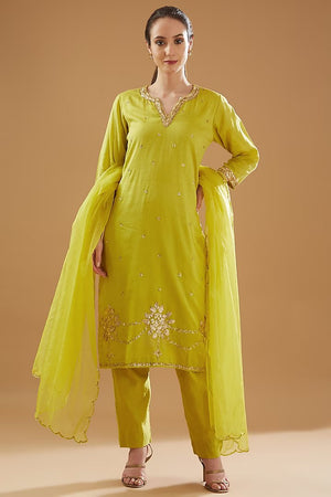Olive Green Straight Suit with Hand Pitta Work Embroidery paired with Pants and Scallop Dupatta.