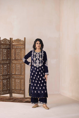 This velvet straight cut suit has festive multicoloured thread and gold zari embroidery on the neck, sleeves, front and pants. Enhanced with metal sequence and tassels.