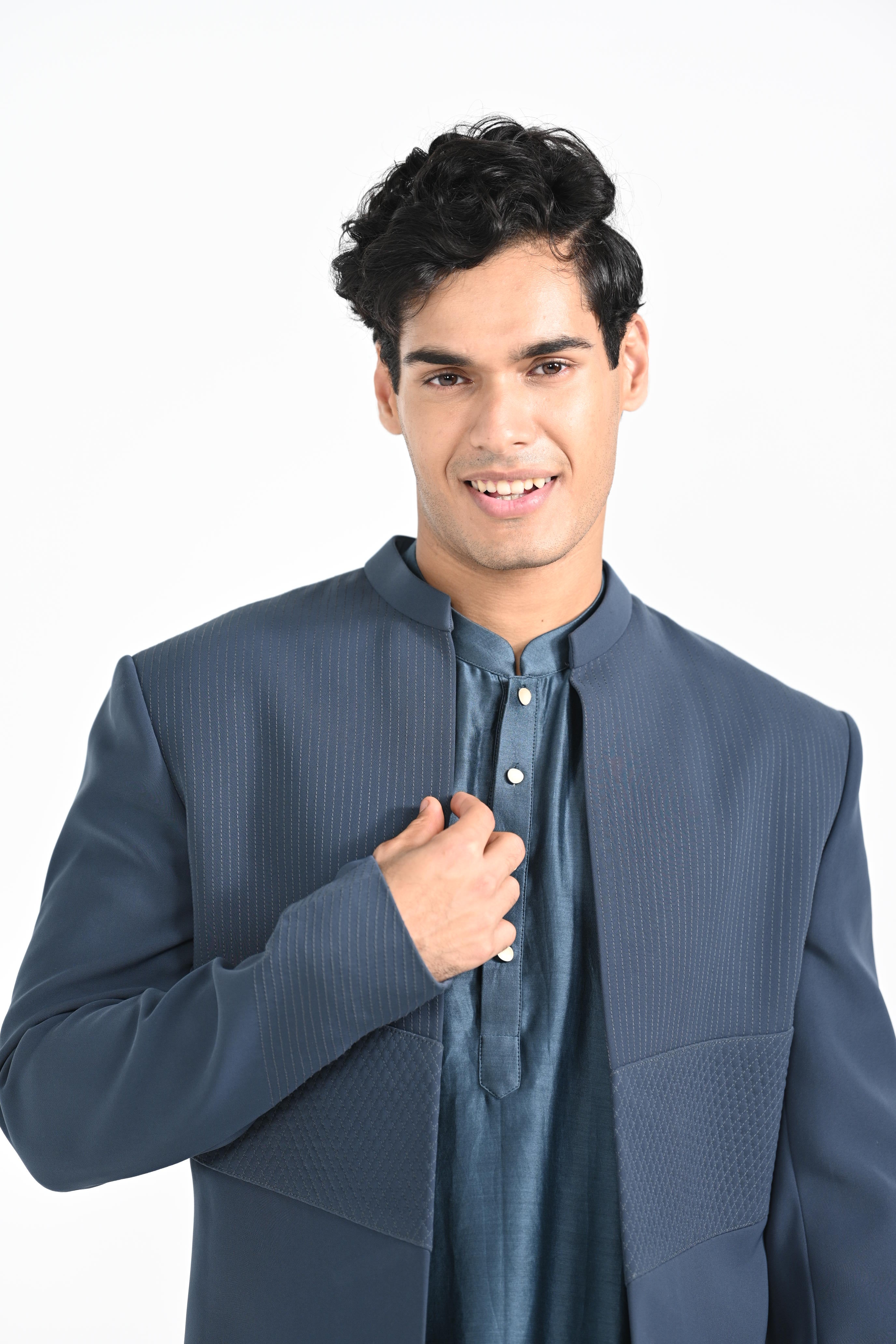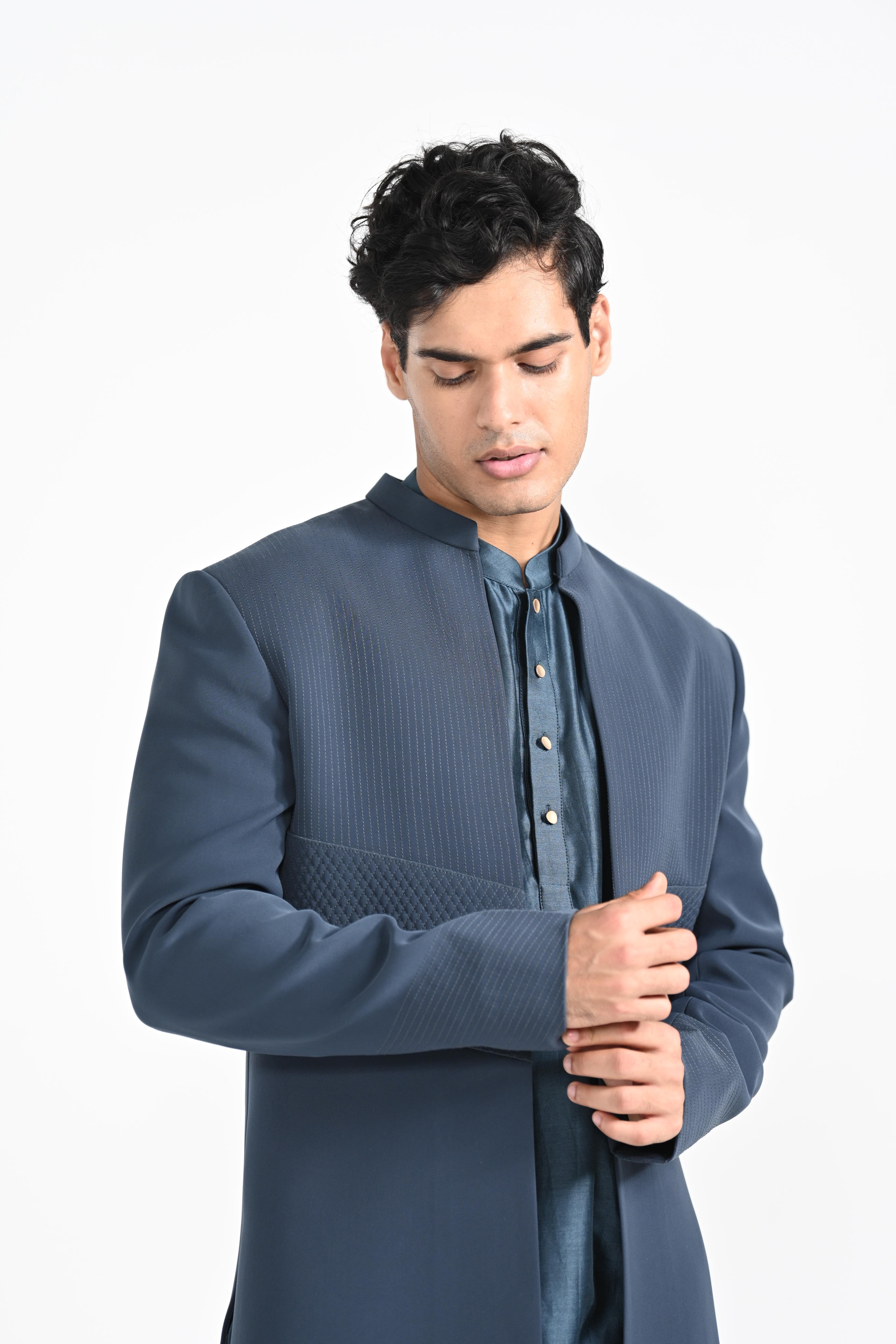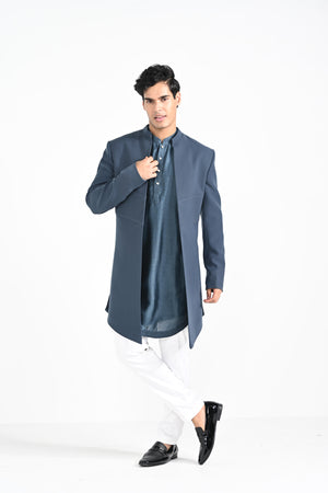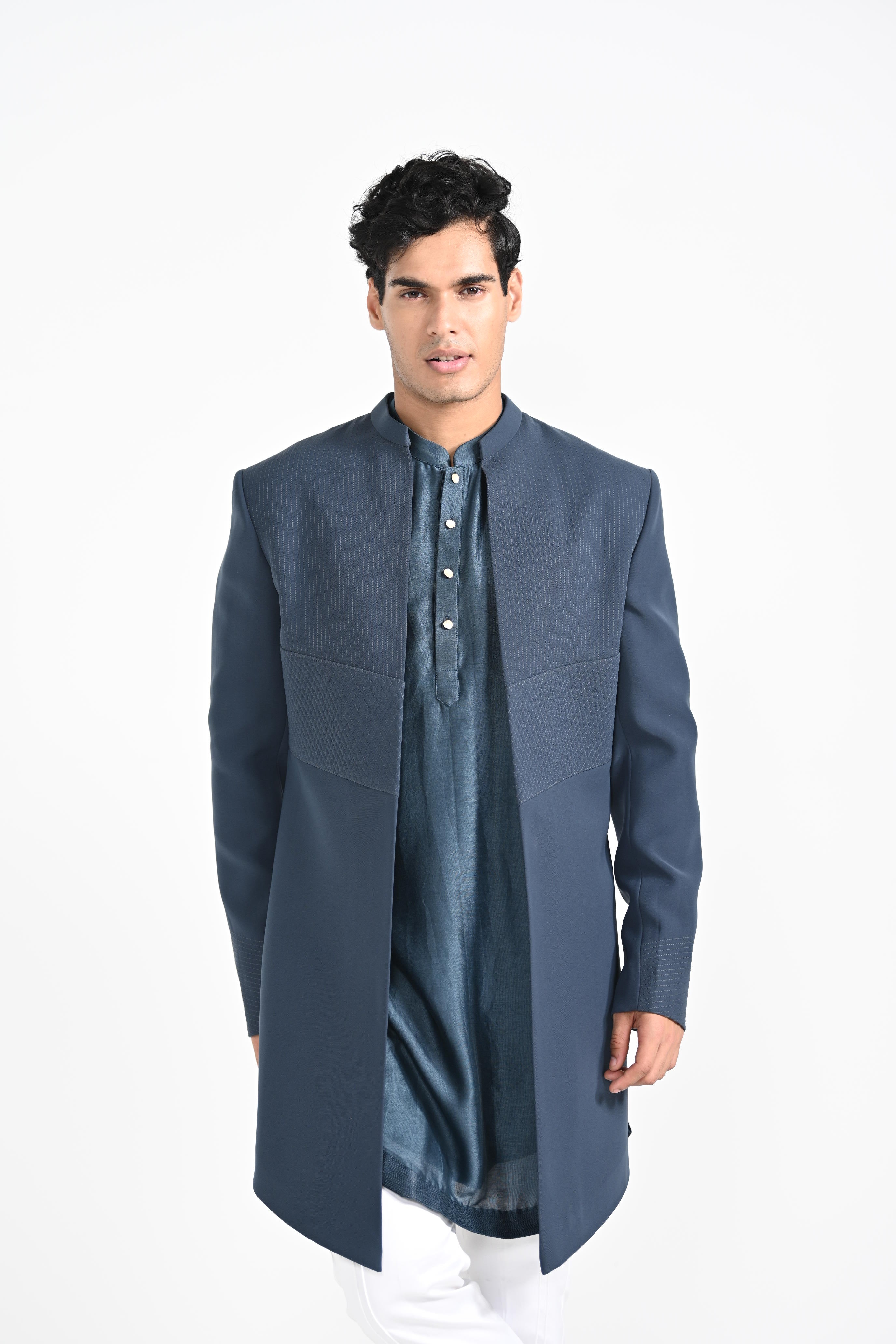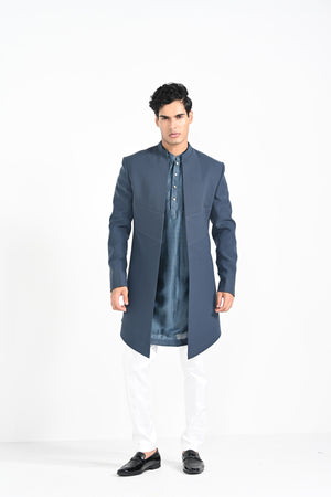 Storm Blue Open Achkan with stitchline detail paired with a plain kurta with same coloured pant pajama. Color of the actual garment may vary due to lighting conditions during the shoot .