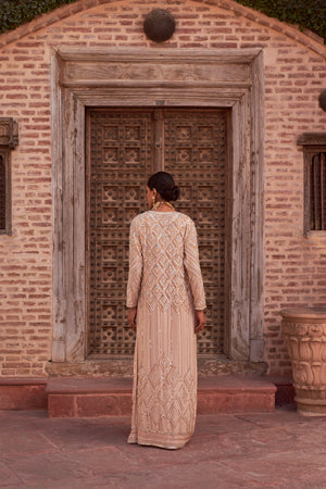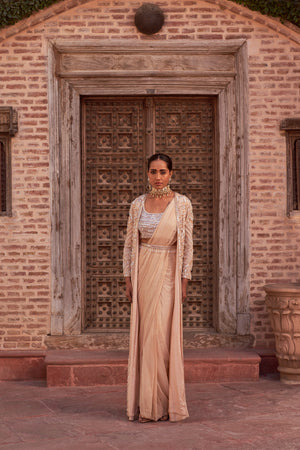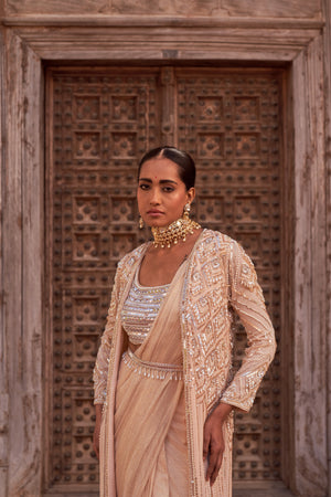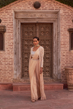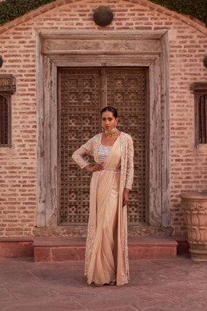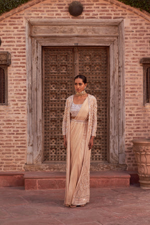 Drape Saree In Foil Gorgette Paired With U Neckline Blouse Which Is Hand Crafted With Pearls, Sequence And Stone Embroidery. The Blouse Is Padded And Have A Side Zip Closure.The Outfit Is Team With Embellished Belt And Fully Embroidered Ivory Cape In Crepe