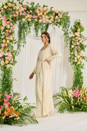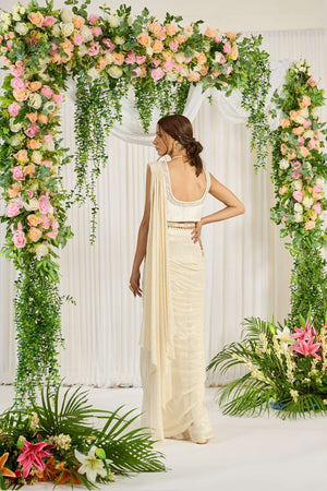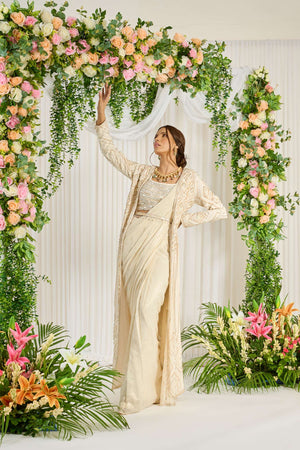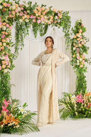 Gorgeous Ivory Saree In Foil Gorgette Paired With Fully Embellished Handcrafted Blouse In Silk. Blouse Has A Flatering U Neckline ,Its Padded And Have Side Zip Closure. The Outfit Is Paired With Intricately Handcrafted Cape In Crepe And Style With Embroidered Belt With Tassel Detailing