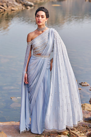 Refreshing Aqua Drape Embellished Saree In Crepe Paired With Stunning Cape Oneshoulder Blouse .Its Intricately Hand Crafted With Crystal Drop , Its Padded And Have A Back Hook Closure.
