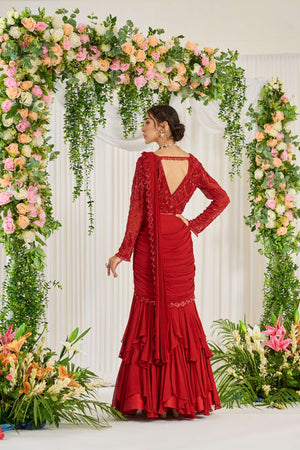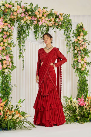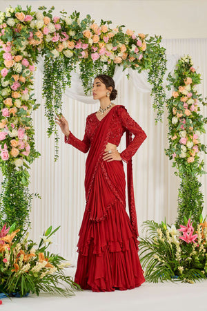 This Gorgeous Red Drape Saeree In Gorgette With Embroidery Detailing At The Bottom And On The Pallo . It Is Paired With Red On Red Fully Embroidered Flattering V Neckline Full Sleeves Blouse It Is Padded And Have Side Zip Closure.