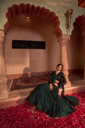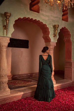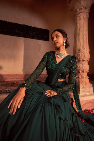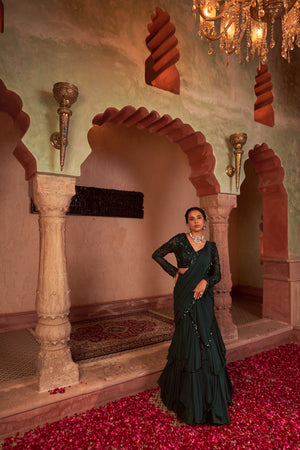 This Gorgeous Bottle Drape Saeree In Gorgette With Embroidery Detailing At The Bottom And On The Pallo . It Is Paired With Red On Red Fully Embroidered Flattering V Neckline Full Sleeves Blouse. It Is Padded And Have Side Zip Closure