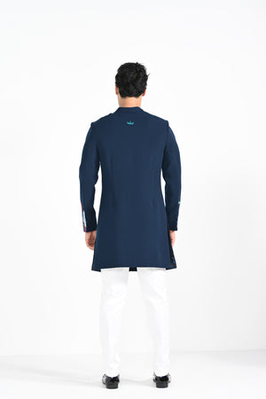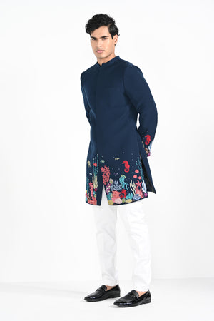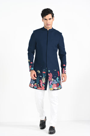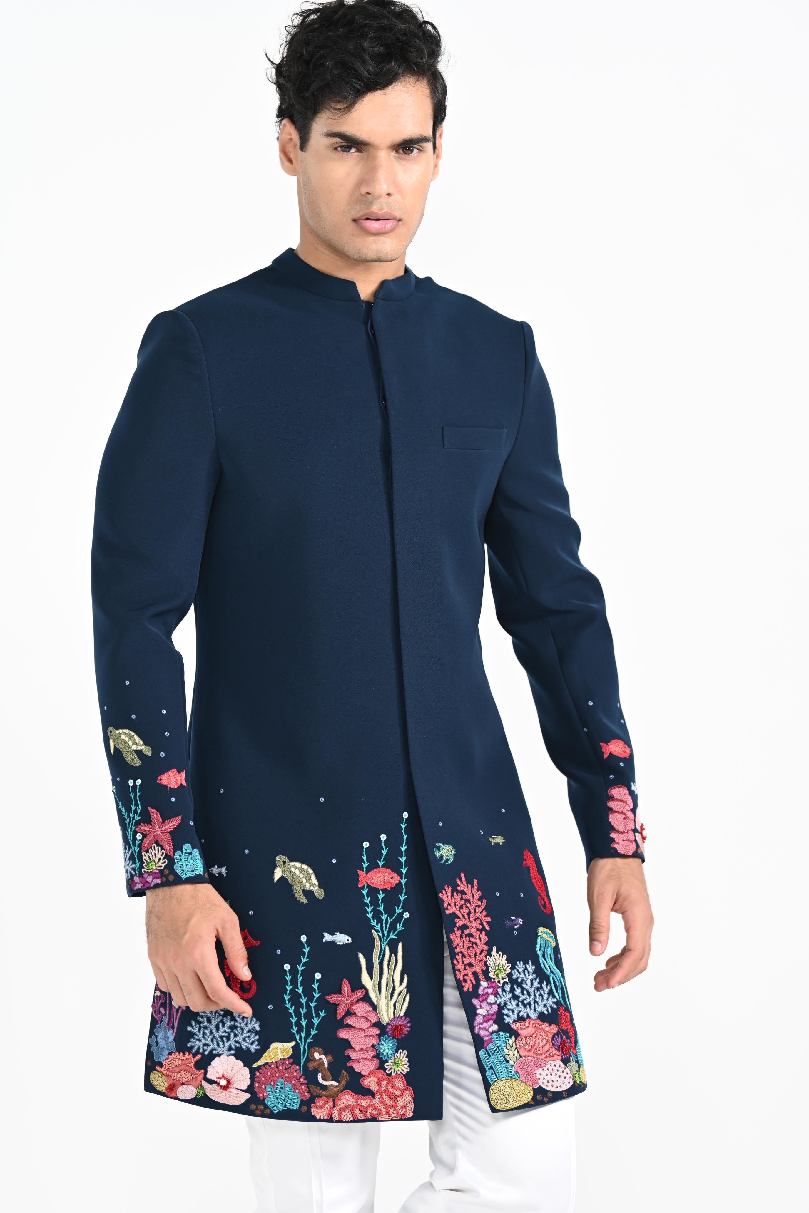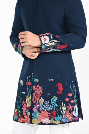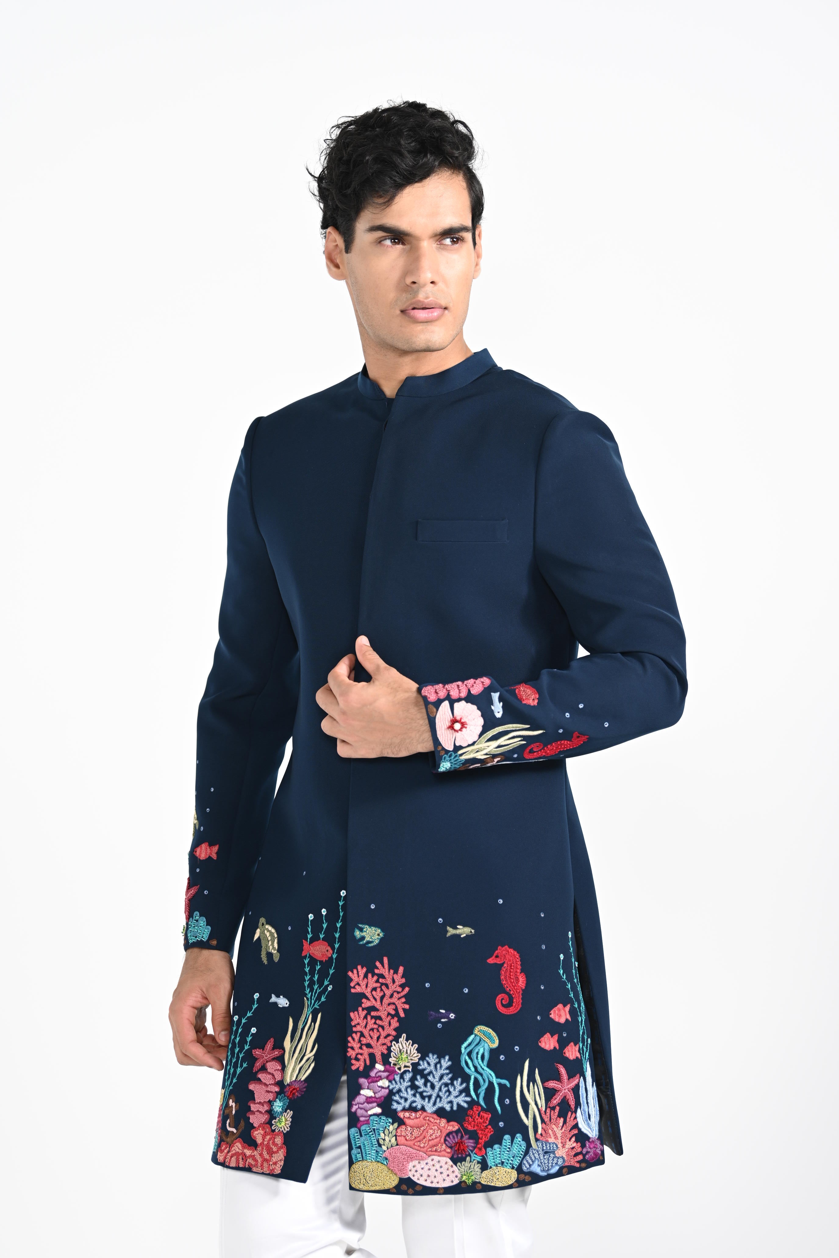 Teal Blue Achkan with Submerged Undersea Inspired Embroidery using colourful threadsand materials paired with white coloured Trousers. Color of the actual garment may vary due to lighting conditions during the shoot .
