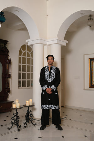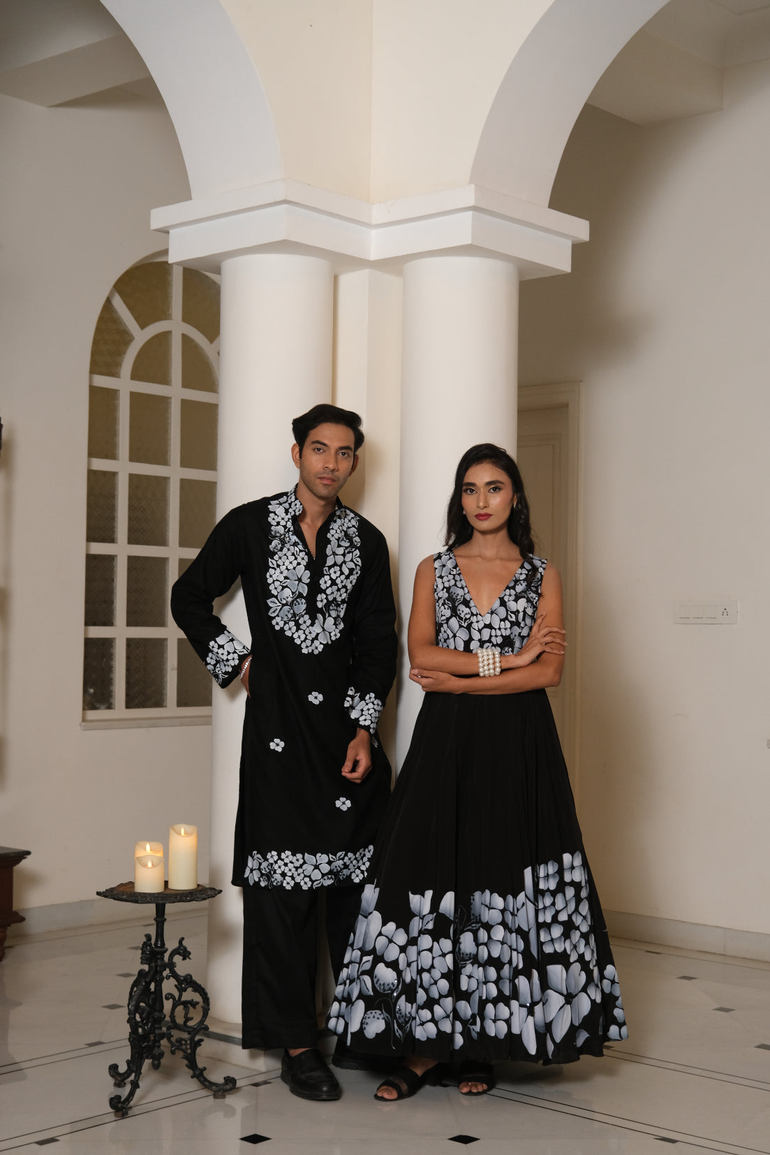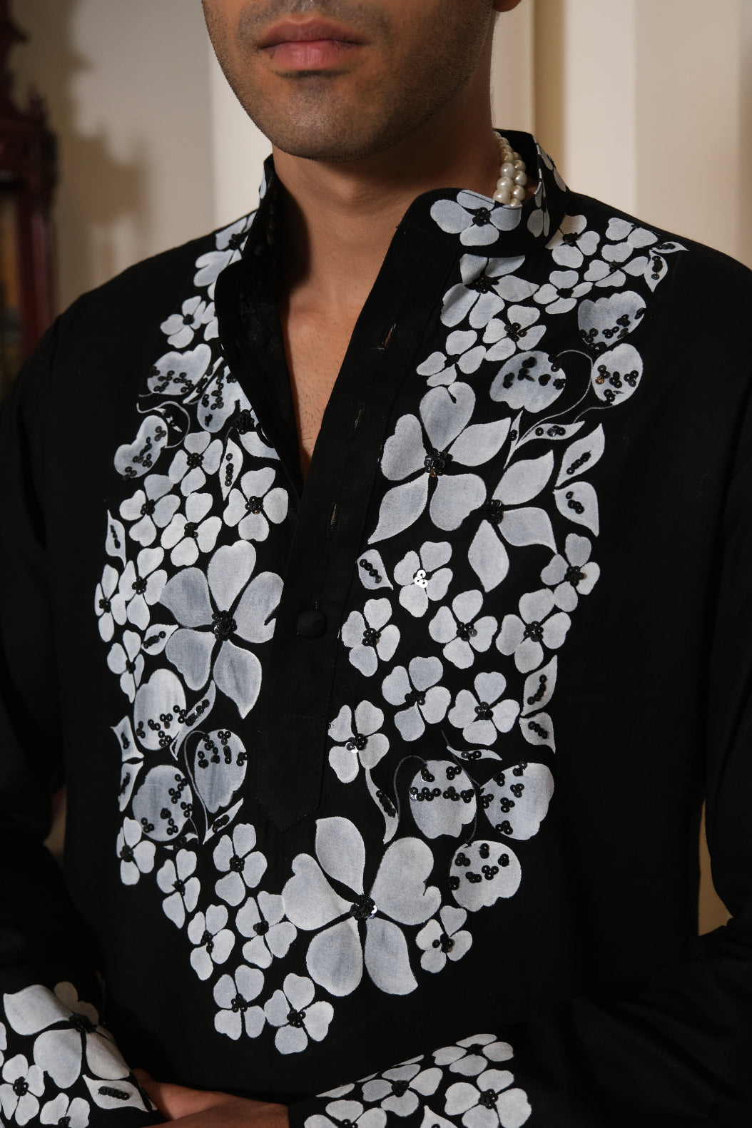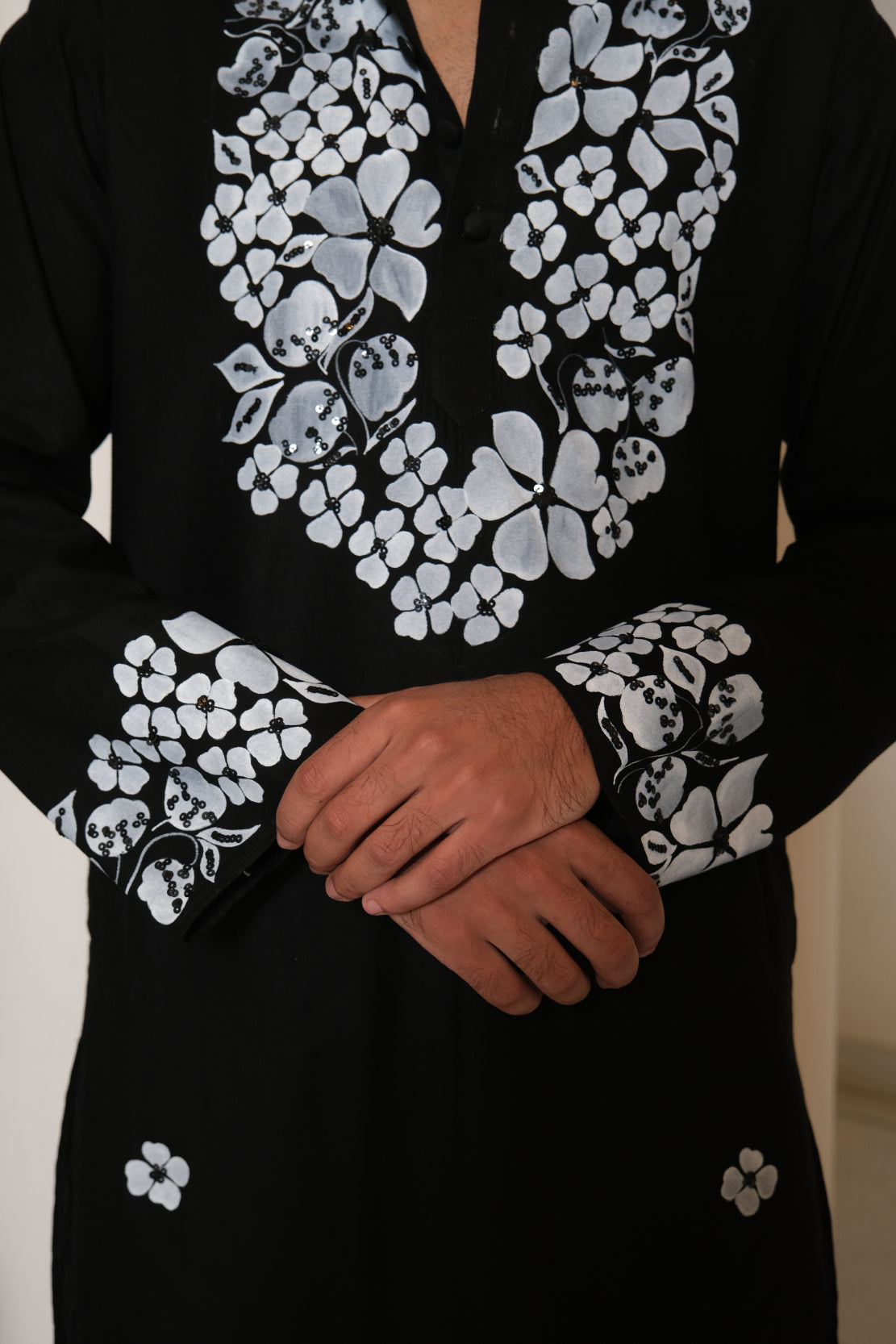 A statement black kurta brought to life with our signature hand-painted floral detailing in shades of white. Crafted in cotton satin, this kurta blends comfort with elegance, making it perfect for festive evenings and special occasions. The intricate artwork around the neckline, cuffs, and hemline adds depth and sophistication, while its timeless silhouette keeps it versatile and easy to style.