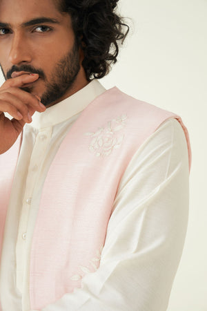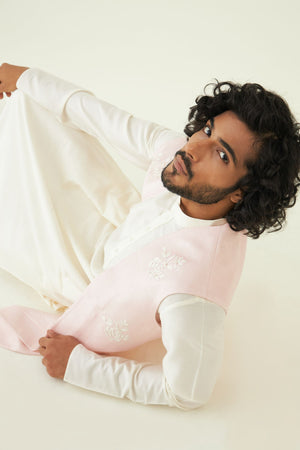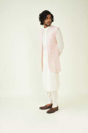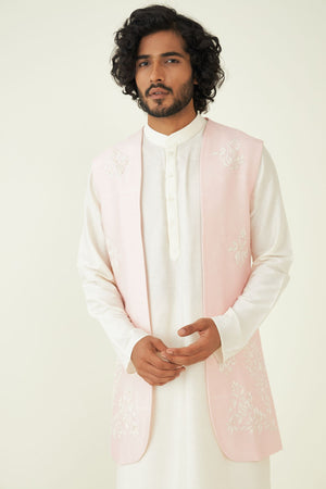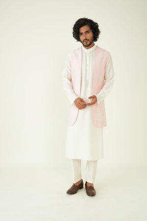 The delicate applique work sets this ensemble apart, offering a distinct and fashionable look. The bundi offers convenience and ensure that every element of your outfit is perfectly coordinated with the kurta set.
