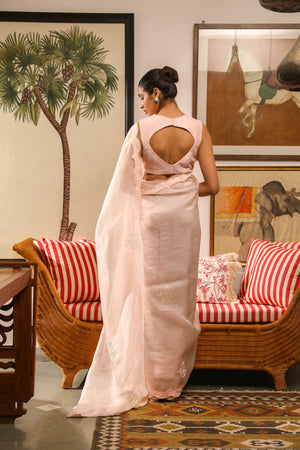 Sufiyaan Saree Set. A Distinctive Feature Of This Ensemble Is The Scalloped Border That Graces The Edges Of The Saree. It Frames The Drape Beautifully, Enhancing The Overall Allure Of The Outfit. The Saree Is Adorned With Mesmerizing Floral Embroidery Crafted With Luxurious White Resham Threads. The Pearl Detailing On Sufiyaan Saree Brings Out The Dreamy Feminine Delicacy. Baby Pink Embroidered Saree With Pearl Detail Tonal Blouse