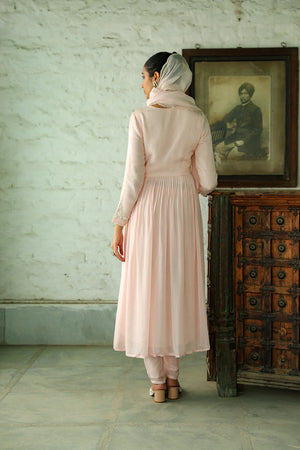 Sufiyaan Kurta Set. The Kurta Has A Bustier Cut, Indicating A Fitted And Structured Bodice Highlighting The Upper Body Contours. The Kurta Is Adorned With Hand-Sewn Pearls And Off-White Resham Embroidery, Adding A Touch Of Elegance And Sophistication. The Dupatta Offers Hand-Sewn Pearl Embroidery With Scalloped Crafting. Powder Pink Embroidered Kurta With Tonal Pants And Dupatta