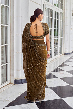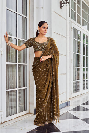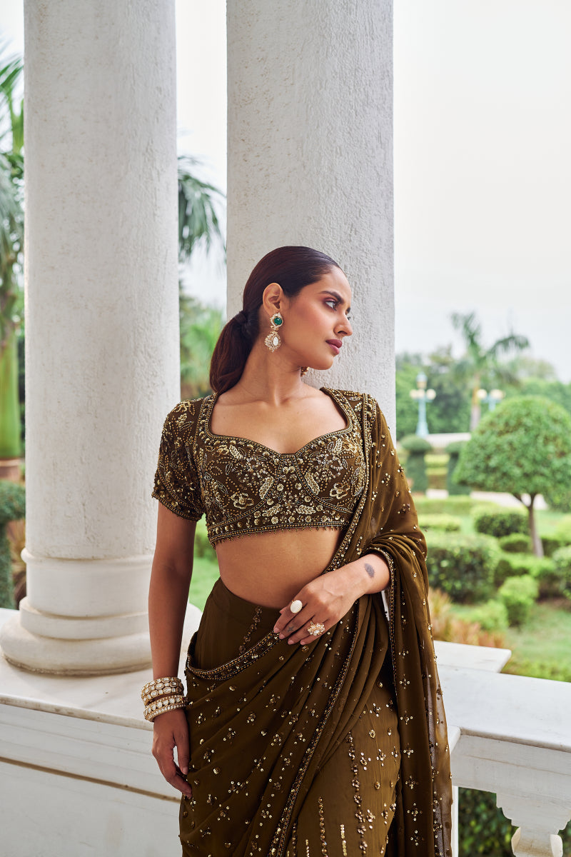This gorgeous saree in georgette has a copper color. The saree which is fully embroided, and the blouse is padded with the floral embroidery.