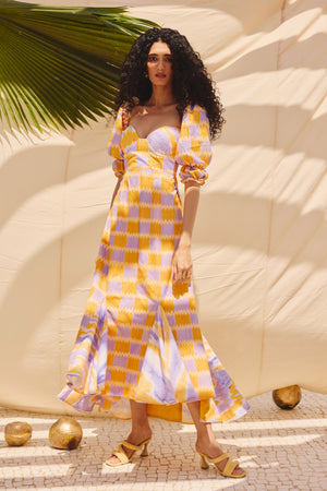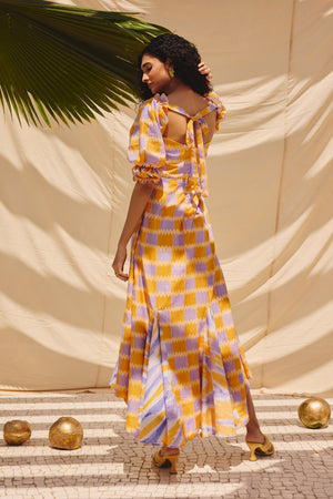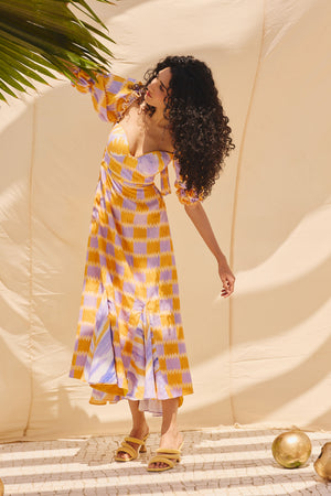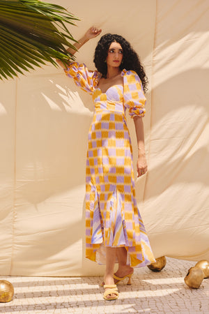 checkered print, while the puffed sleeves add a whimsical, vintage flair. The playful frill details at the bottom create a soft, feminine flow, making it the perfect combination of bold style and effortless elegance for any summer event.