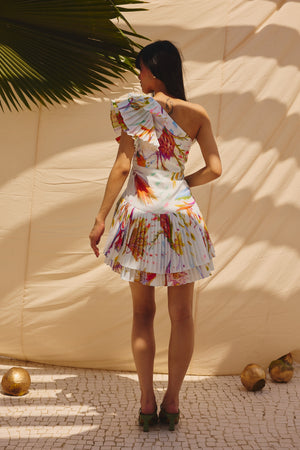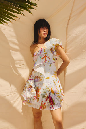 This one-shoulder short dress features knife pleat details that create delicate frills along the bodice, adding texture and movement. The bottom of the dress is enhanced with two layers of pleated frills, which provide added volume and a playful, flowing effect. The sharp pleating throughout gives the dress a sleek, chic appearance, making it a perfect blend of modern style and feminine flair. Ideal for parties or evening events, this dress offers a bold yet elegant look.
