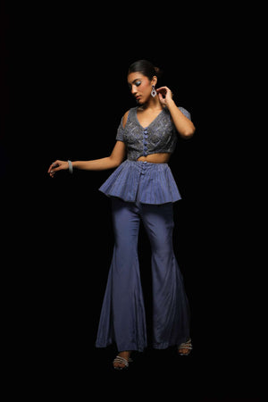 Suprenal is a peplum set with a cut out at the waist. The outfit had soft 'V' neckline with cold shoulder, highlighted with celestial motifs.