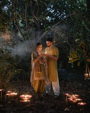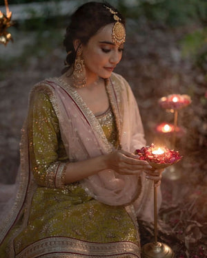 This ensemble features a knee-length,round neck kurta with intricate hand embroidery highlighted by delicate sequin and thread work. Paired with matching dhoti-style pants and net dupatta with shimmering details and a beautifully crafted border.