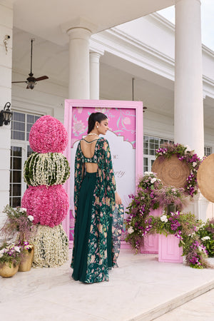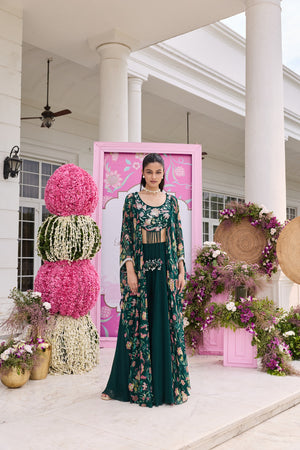 Printed Embellished Choli With Tassels And An Attached Cape Paired With Sharara