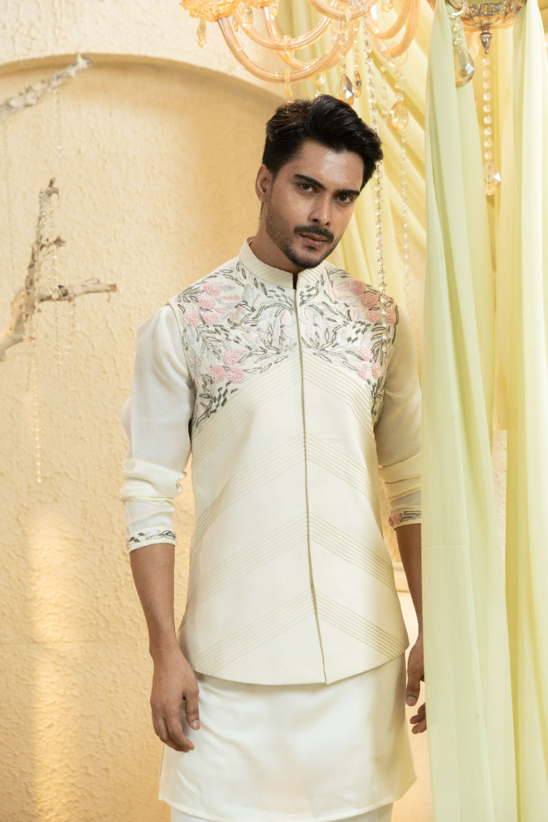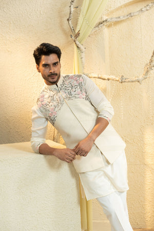 Swan White Hand-Embroidered Bundi