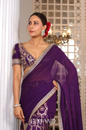 This regal saree exudes timeless elegance with its rich fabric and intricately embroidered details. The blouse is heavily embellished perfectly complementing the saree. The drape flows gracefully, showcasing a beautifully embroidered lower half with elaborate patterns that add depth and grandeur.