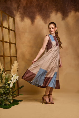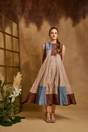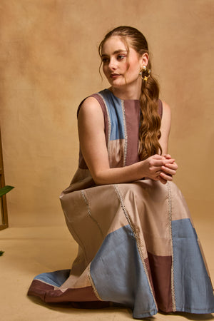An A-line dress featuring panel-cut lace inserts and color-blocked panels arranged in a piano effect, combining structured elegance with delicate textural detailing for a refined, contemporary silhouette.