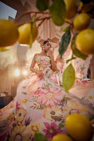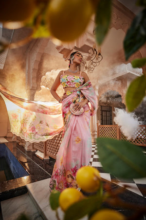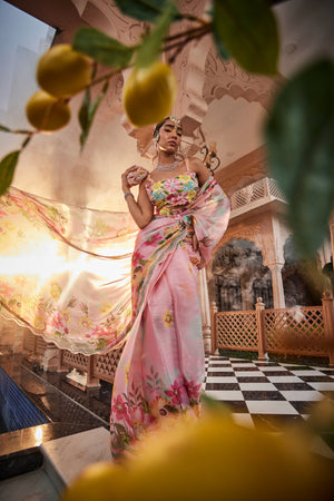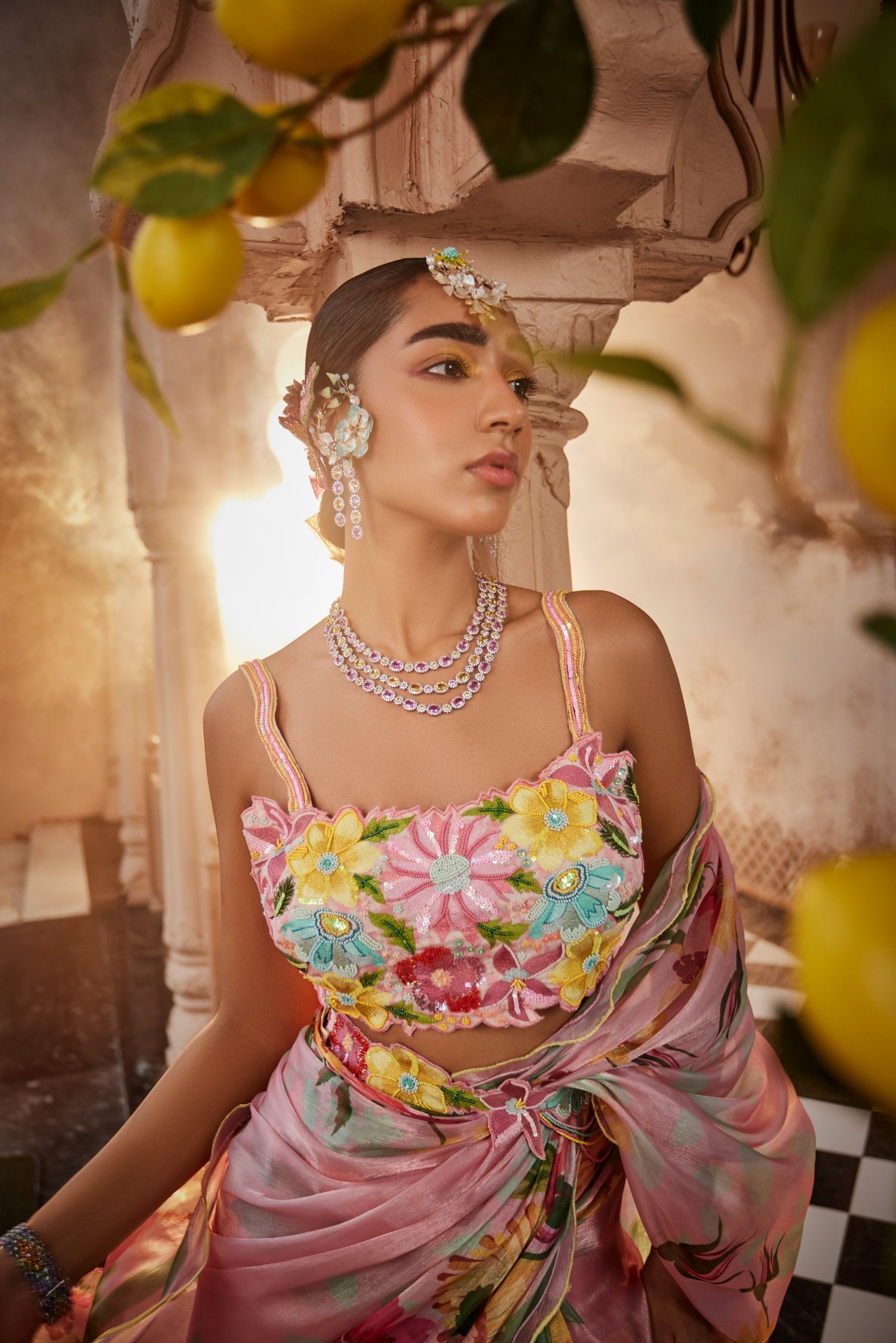 Presenting an elegant glass silk saree adorned with a delicate floral print, paired with a meticulously hand-embroidered floral blouse featuring intricate details. To elevate the saree’s elegance, it is styled with a fully embroidered cutwork belt, further enhancing its overall look. The vibrant colors and prints of the saree give it a fresh and lively appeal.
