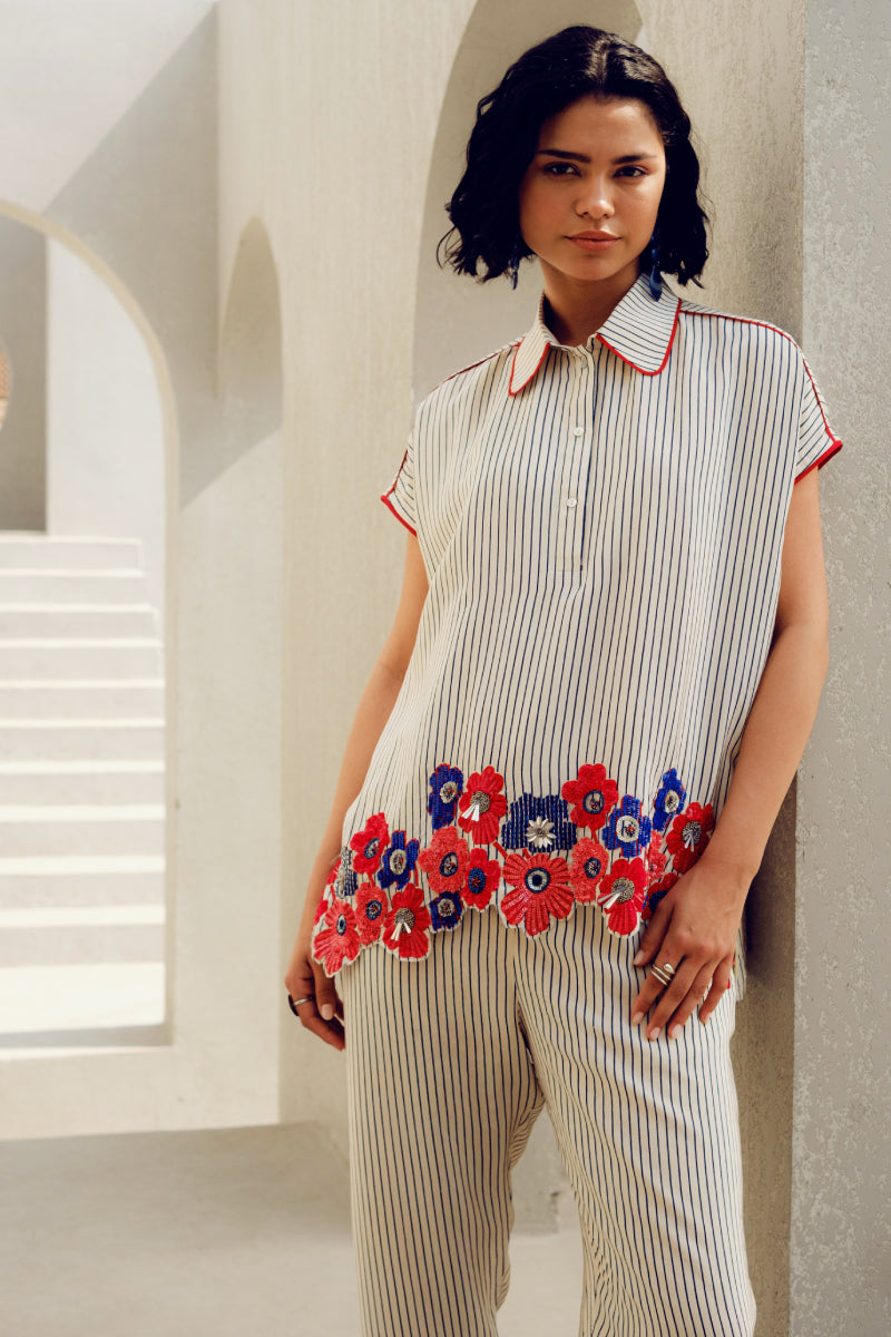 The Sylvie shirt has short sleeves and a regular collar. It comes in a striped pattern with delicate floral detailing and sequins at the hemline.